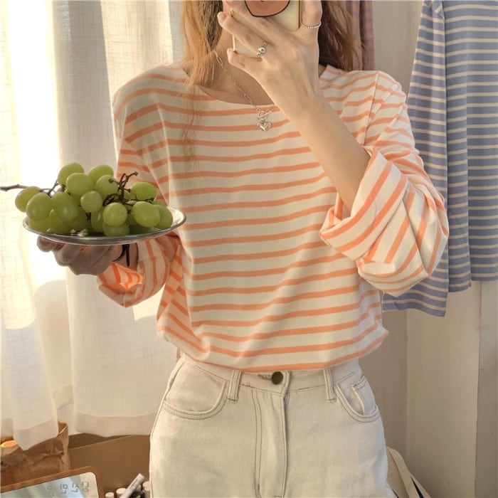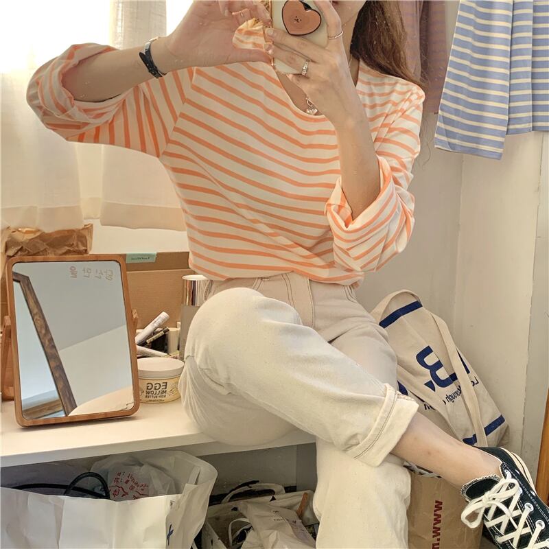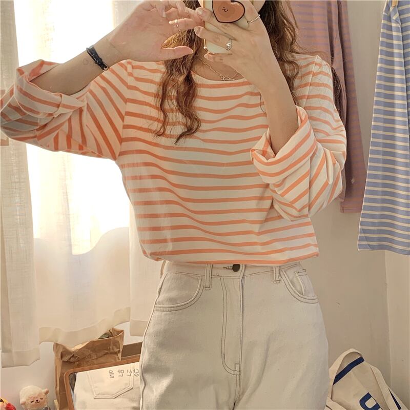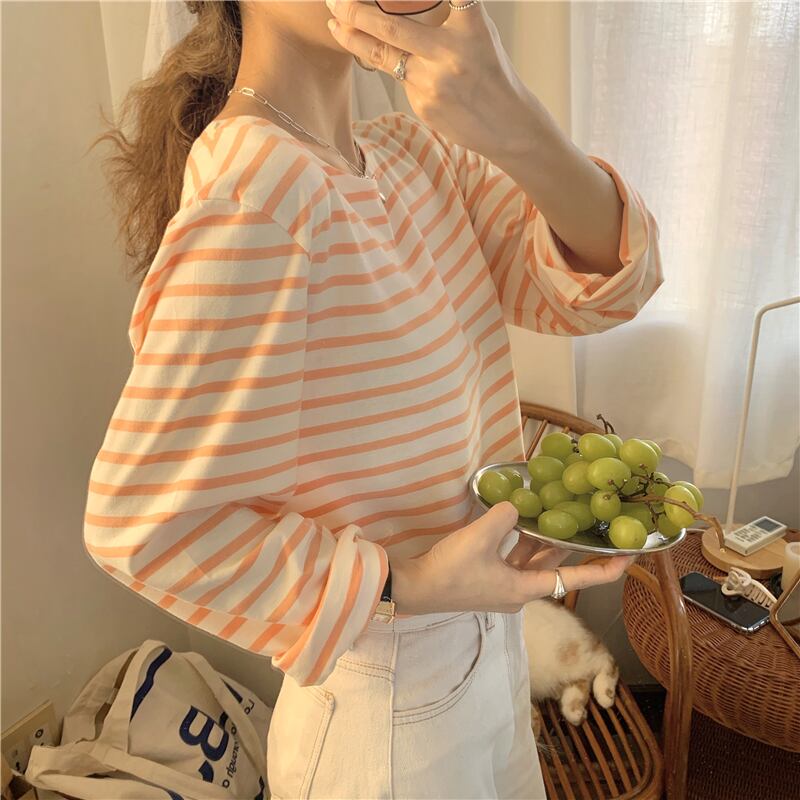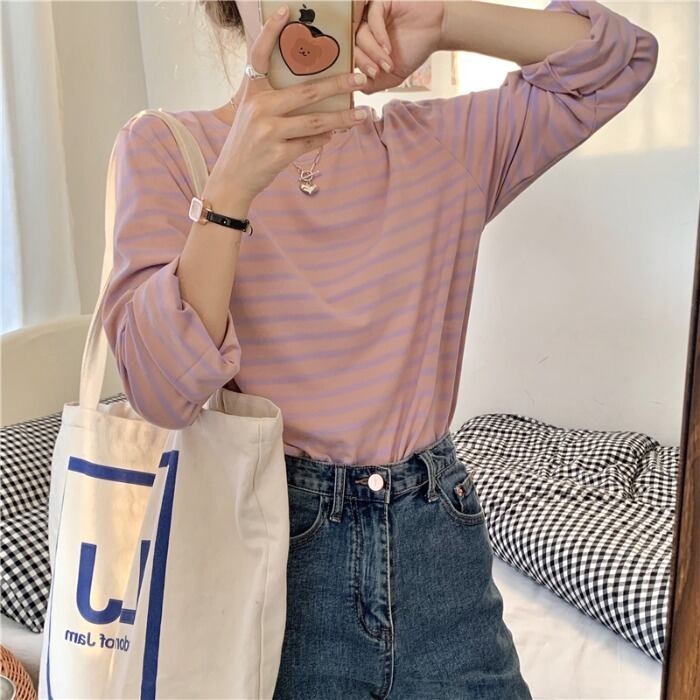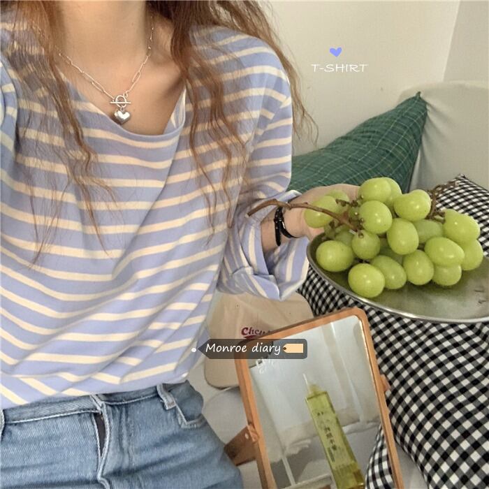 韓国ファッションルーズストライプTシャツシャツ レディーススプリングゆったりトップス トレンド ロング 春物 スタイル 長袖 MONROE62209687508