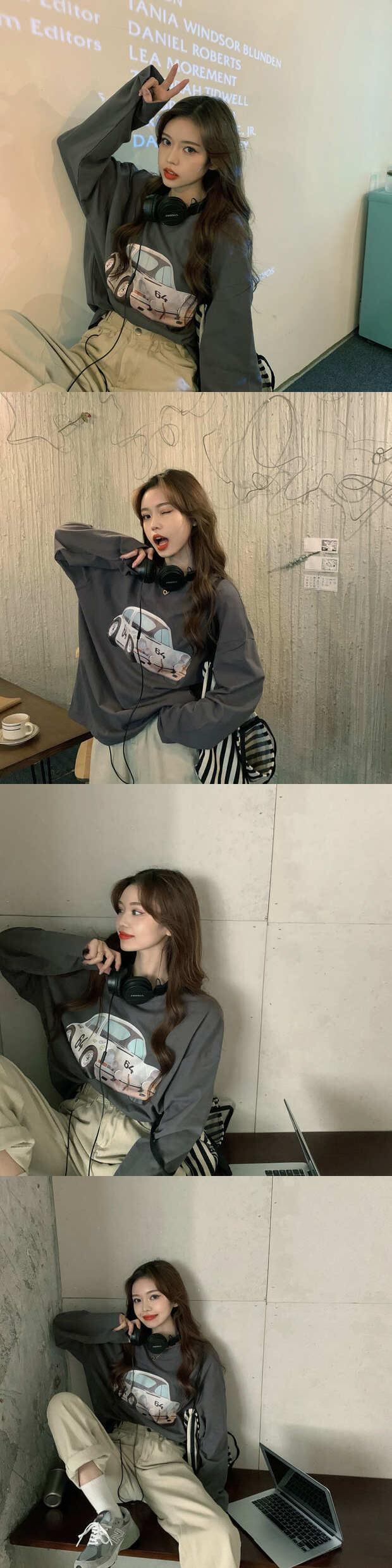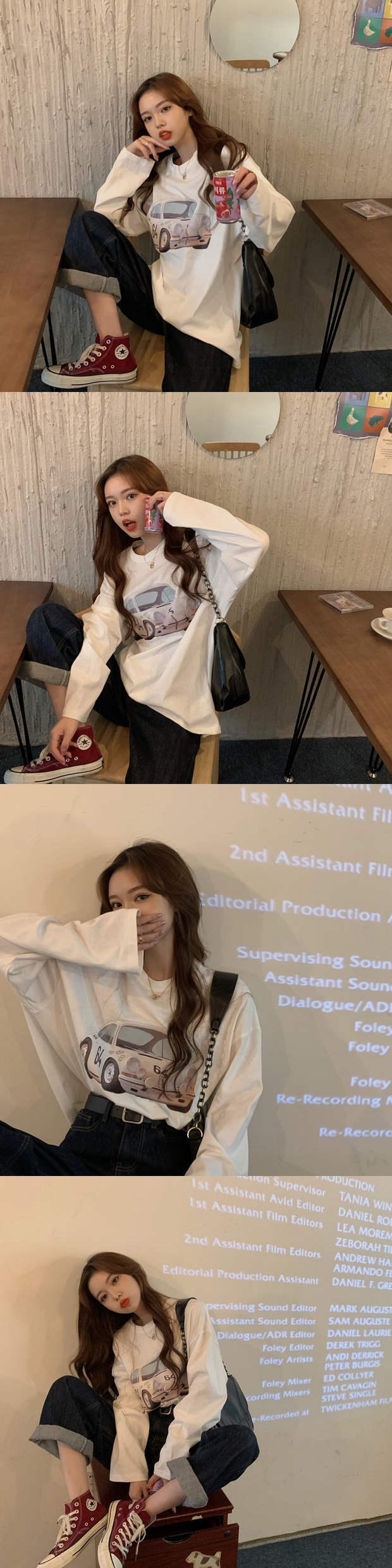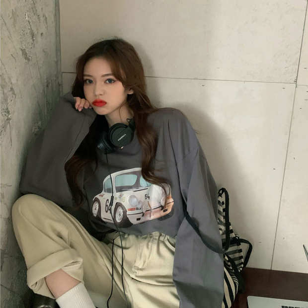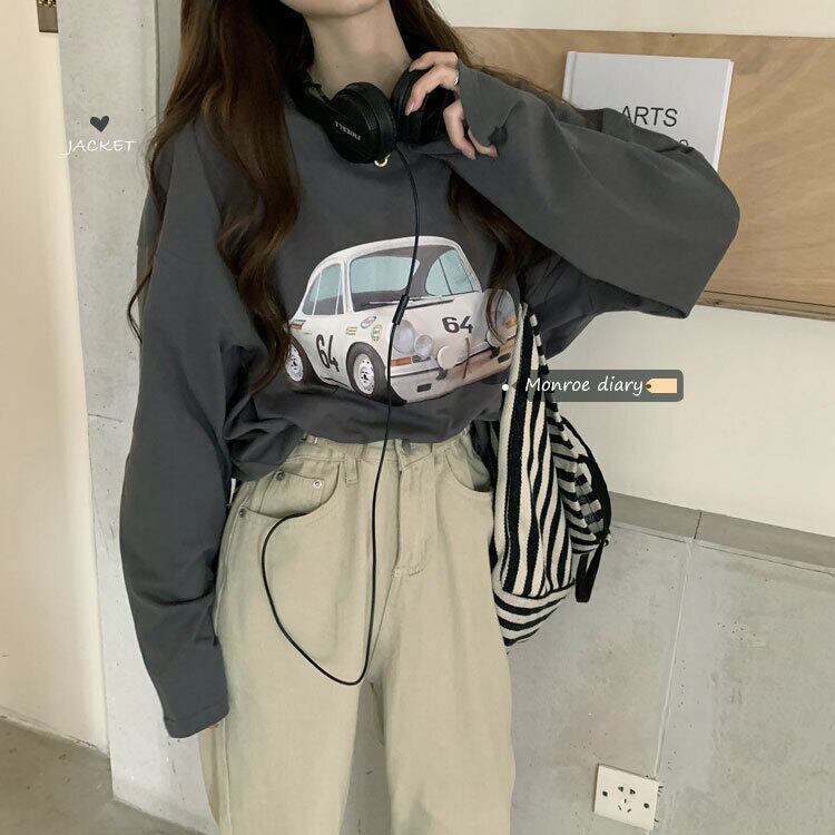 スタンダードプリントTシャツ秋物ルーズカジュアルトップス トレンド ロング レトロ オータム 長袖 ミドル丈 MONROE81659407356
