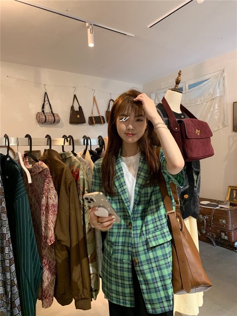 スタンダードグリーン格子柄シャツ レディーススプリング夏服ジャケット レトロ 春物 夏物 MONROE32548917816