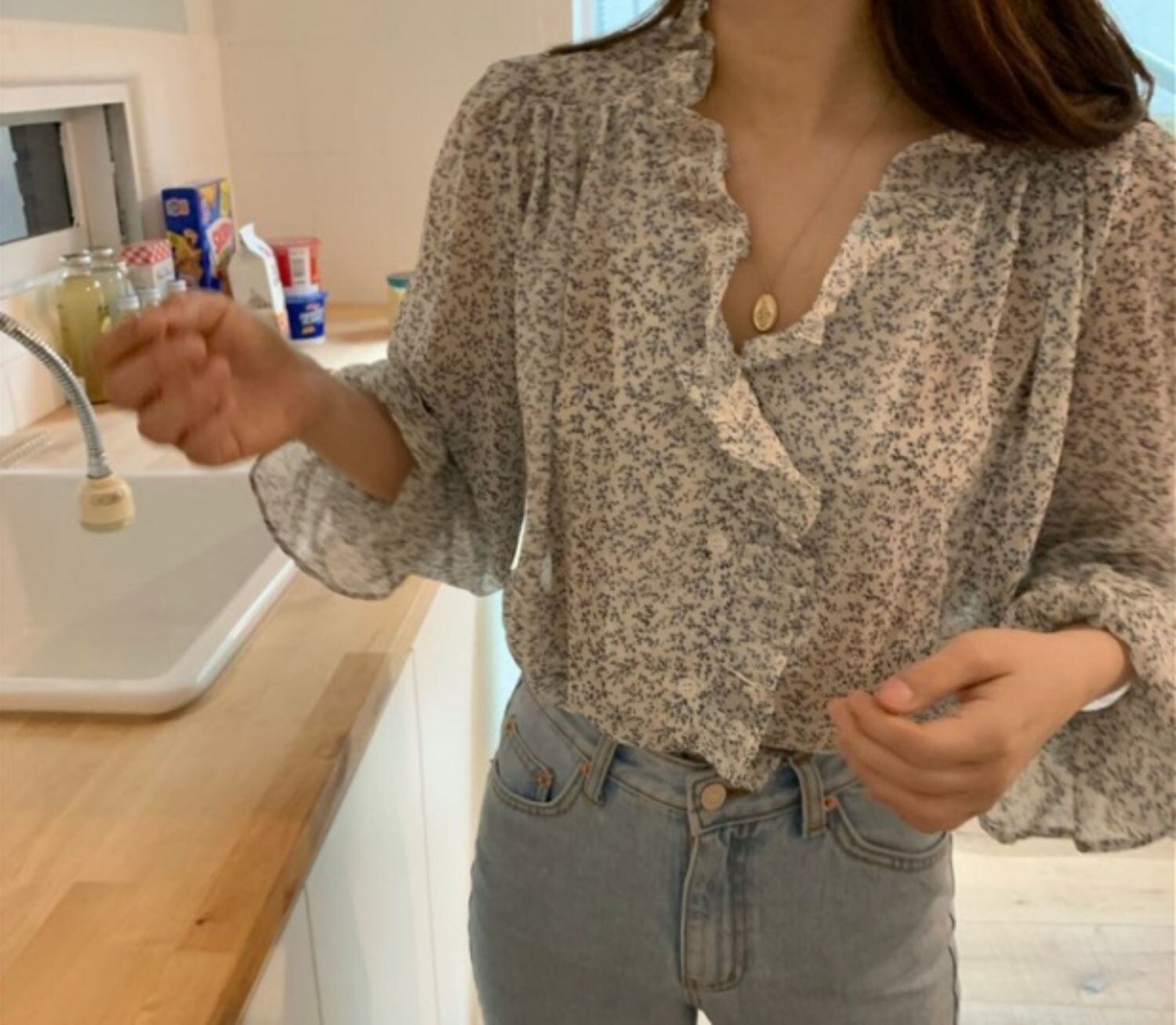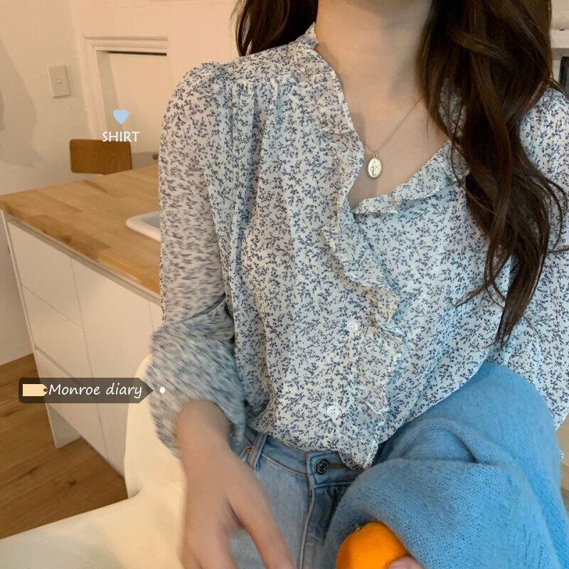 フローラルVネックシャツ スプリング韓国ファッションルーズカジュアルブラウス レディース ロング 春物 花柄 長袖 ミドル丈 MONROE4527875