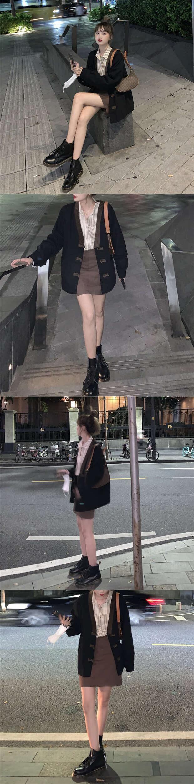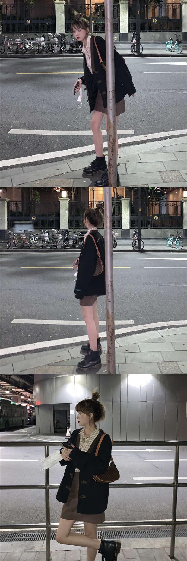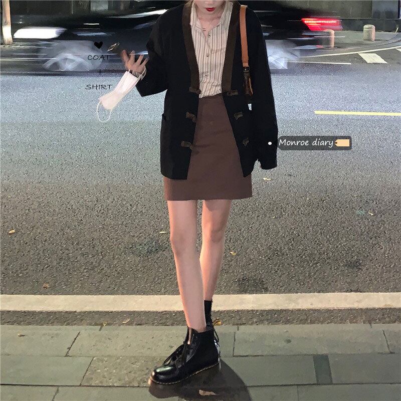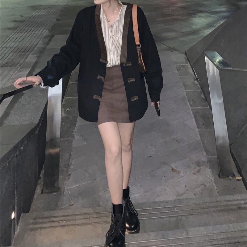 スタンダードVネックバックルジャケット 秋物ルーズ薄手トップス ロング レトロ オータム 長袖 ミドル丈 MONROE78772132816