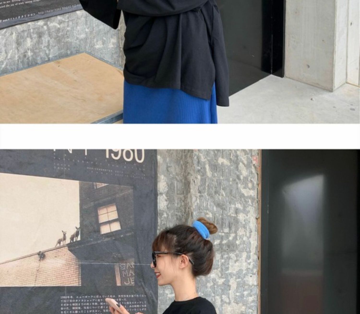 色:ブラックトップ,黄色のシャツ,青いスカート,黒スカート