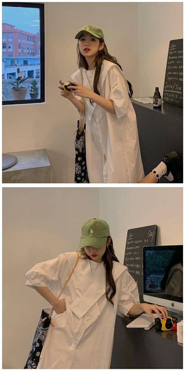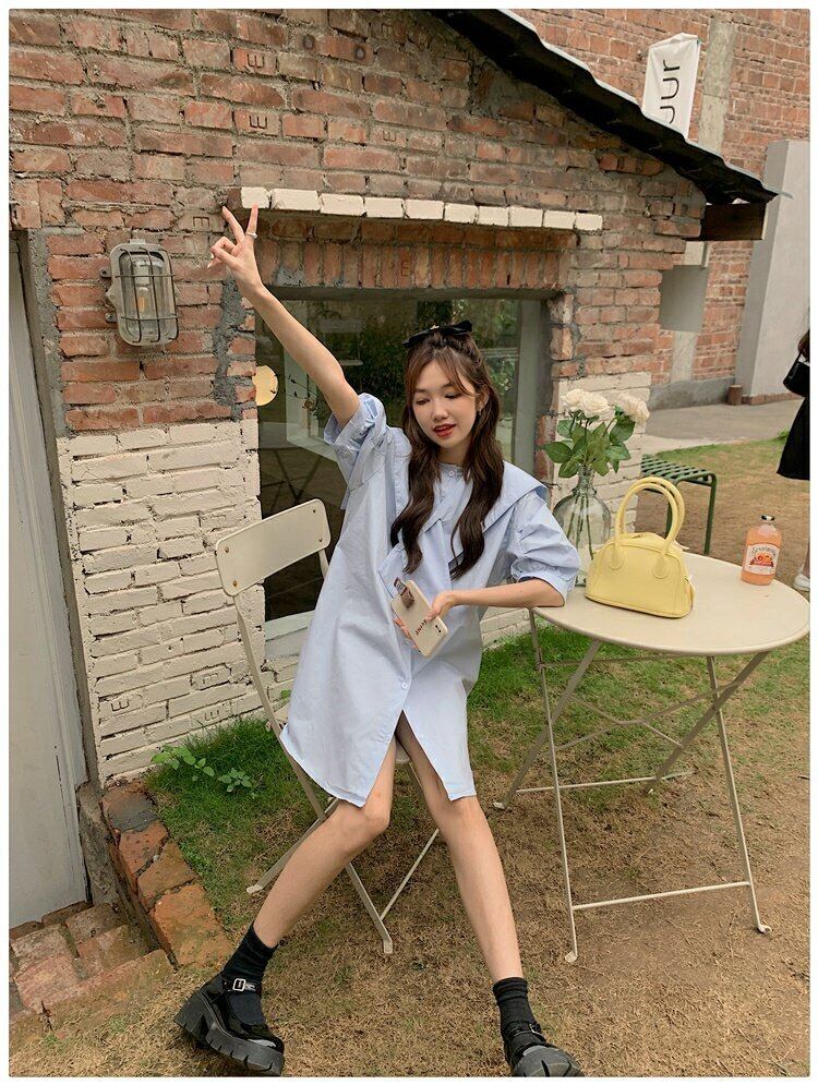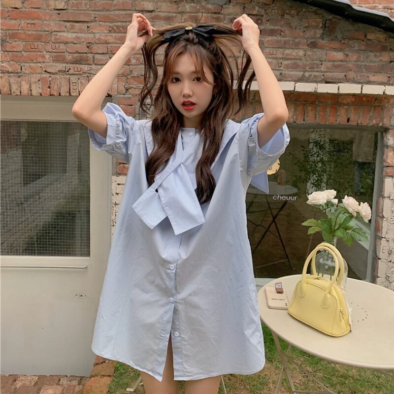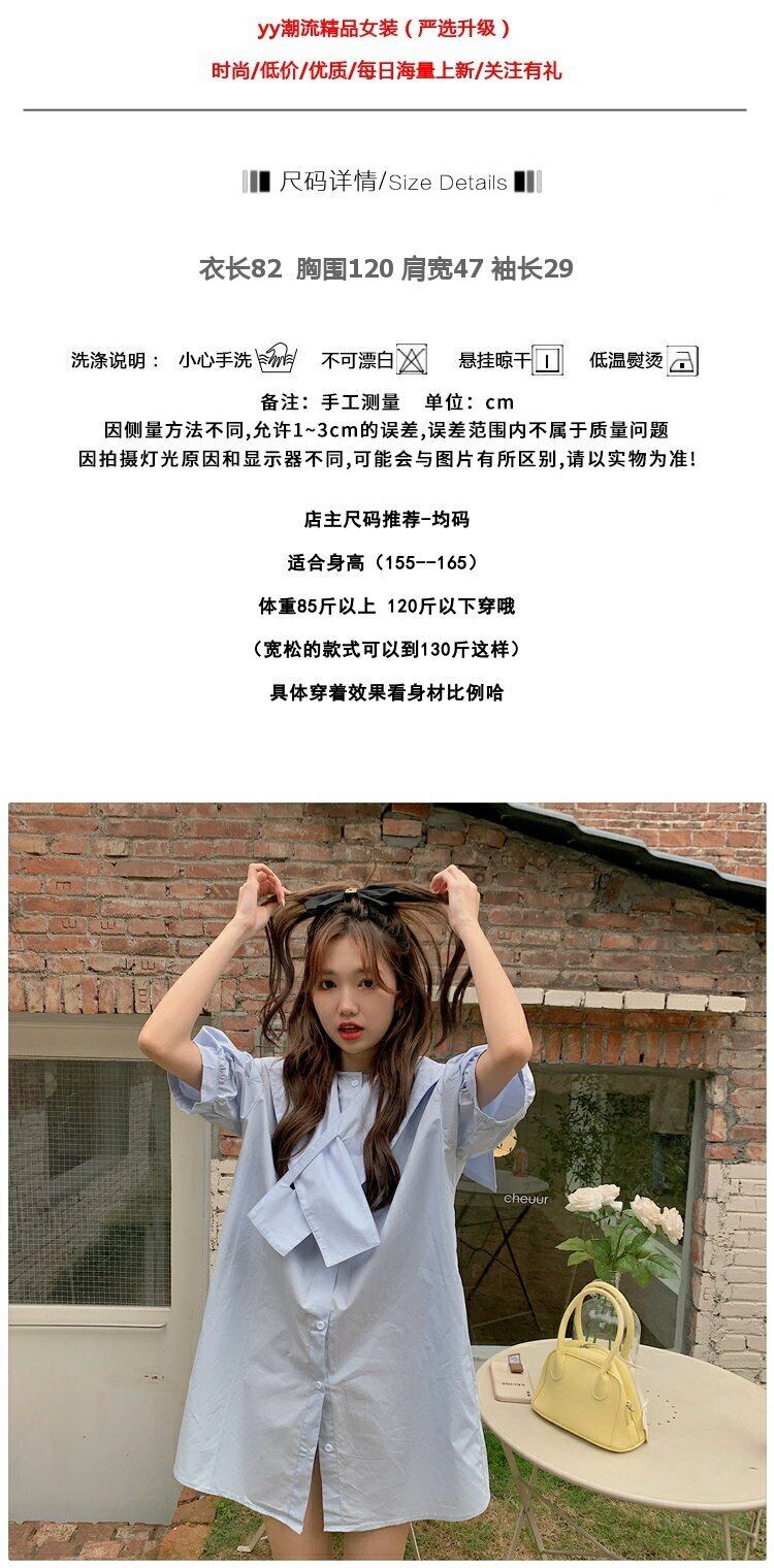 夏服韓国ファッションネイビーカラールーズシャツ トップス レディース 大きめサイズ 夏物 スタイル ミドル丈 YY75552184273