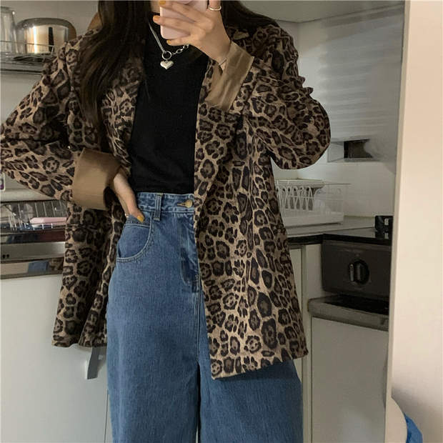 スプリング韓国ファッションカジュアルレオパードプリント柄ダブルブレストジャケット ルーズブラウス 春物 スタイル ミドル丈 MONROE39713350411