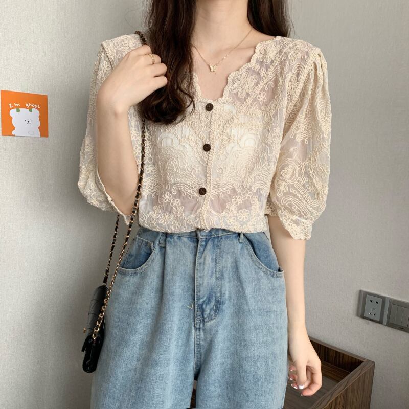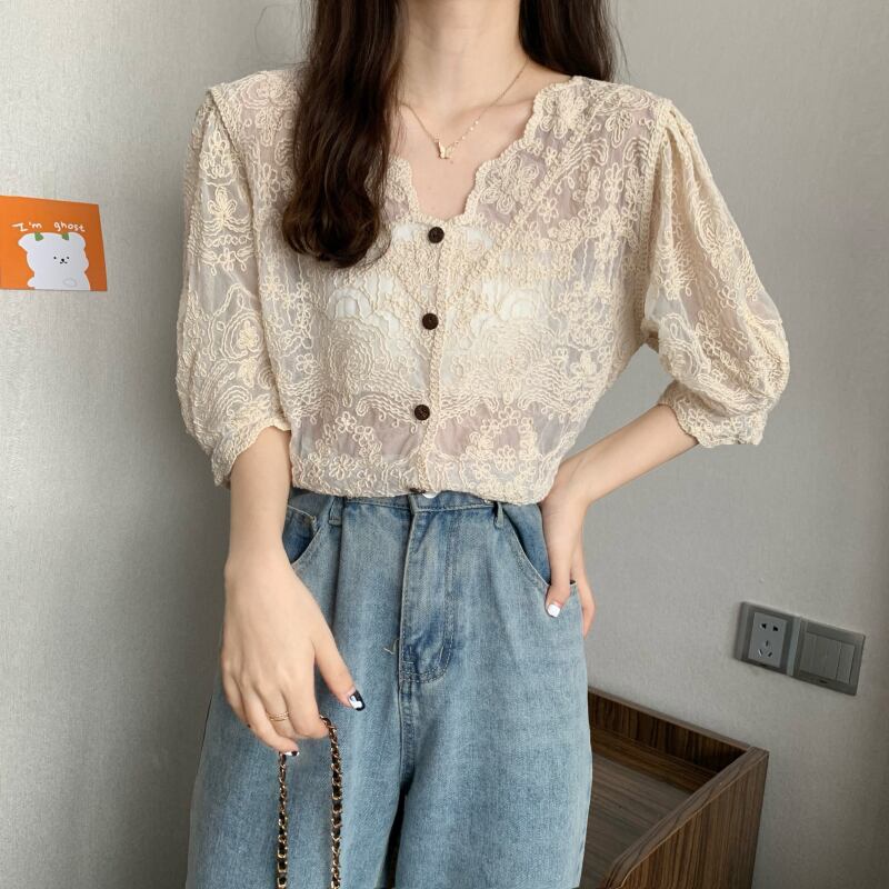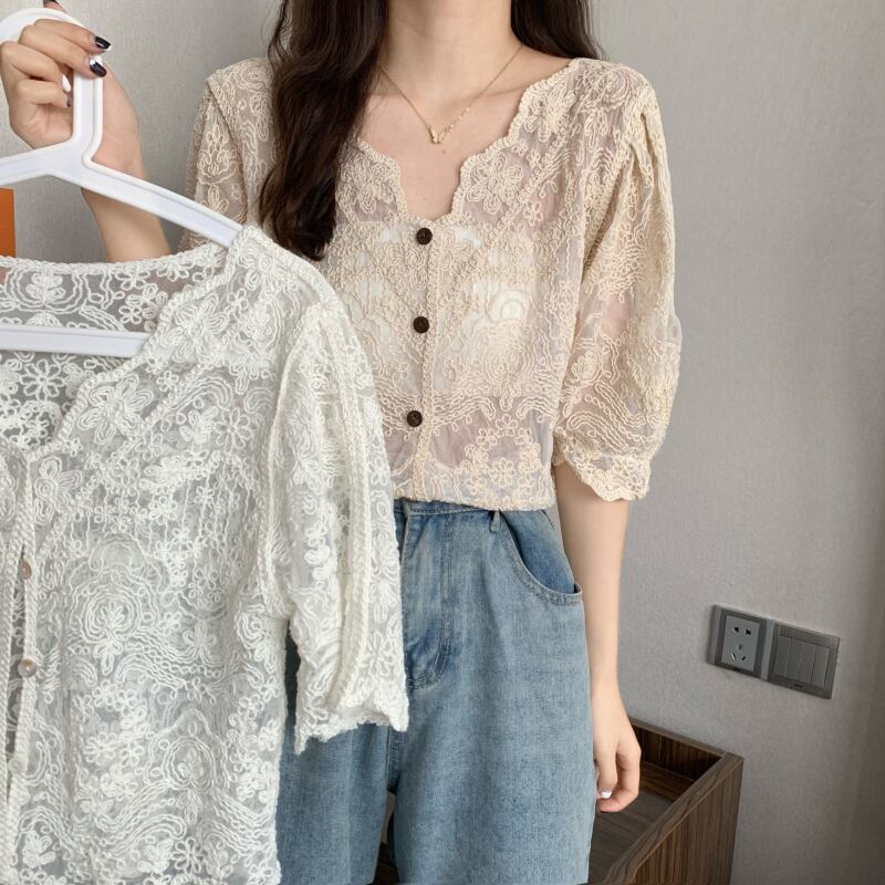 夏服スタイル薄手Flowerデザイン ショートトップス 半袖スリーブシャツ カーディガンシフォン ハーフスリーブ 夏物 フラワーデザイン YY33239208921