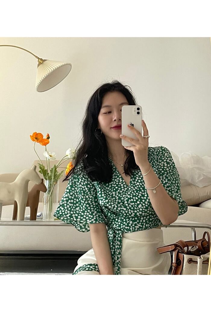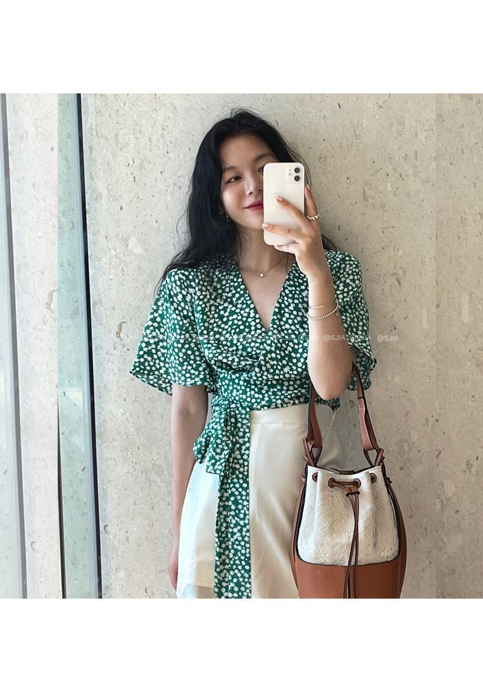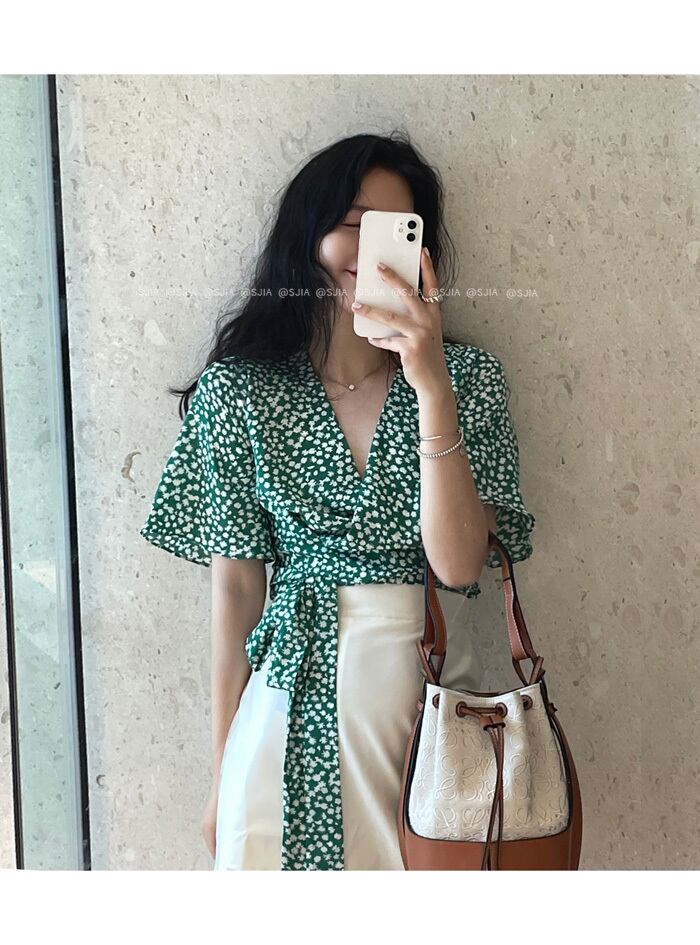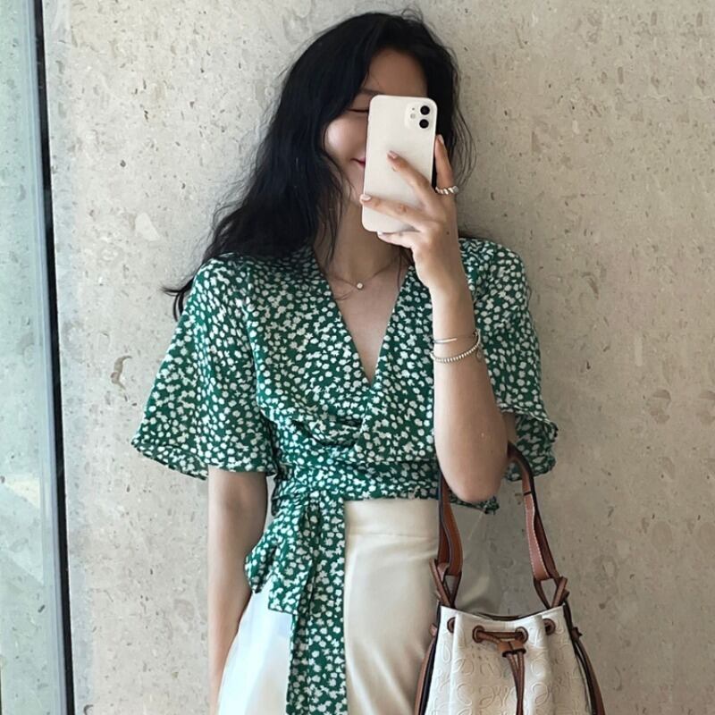 フローラルシャツ 夏服スタンダードレースVネックショートトップス 薄手 レトロ 夏物 花柄 YY85046823868