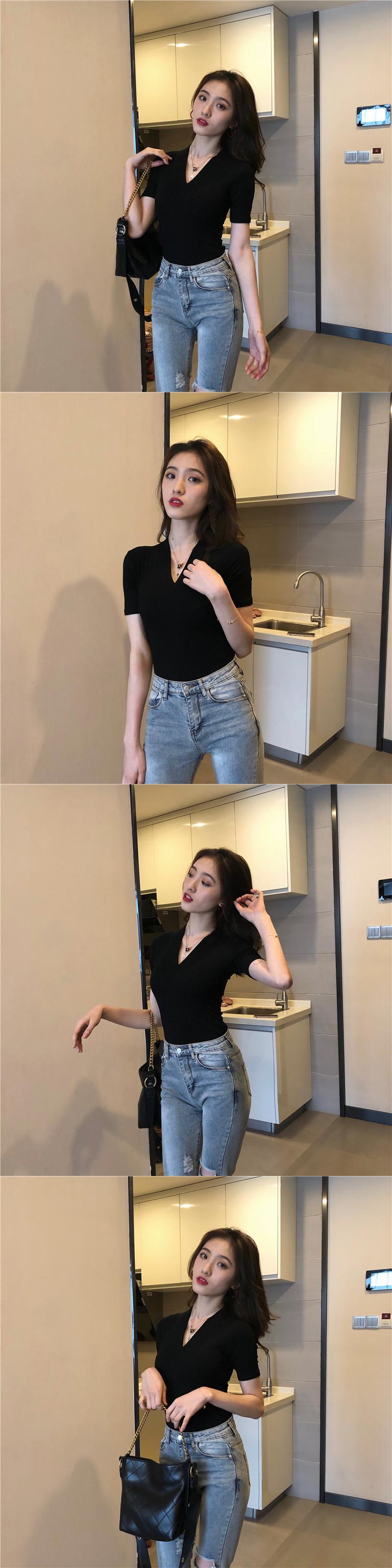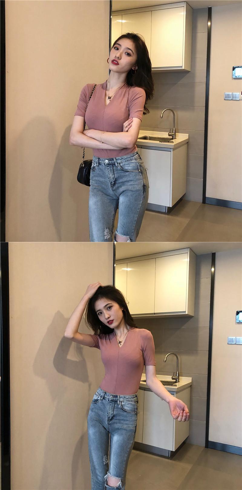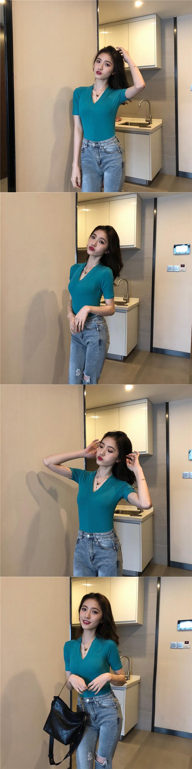 ゆったりシャツ トップス スプリング夏服韓国ファッションソリッド カラーTシャツスリムVネック 春物 夏物 ソリッドカラー スタイル YY14605918587