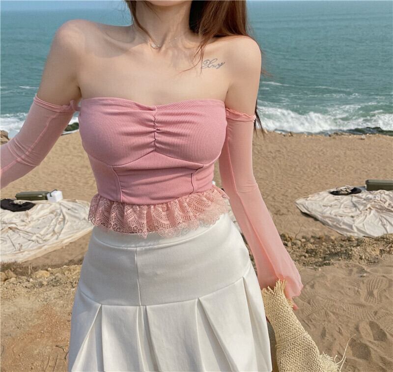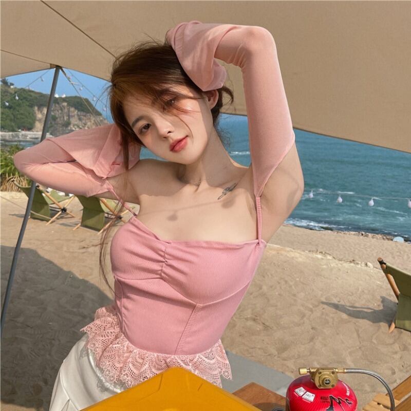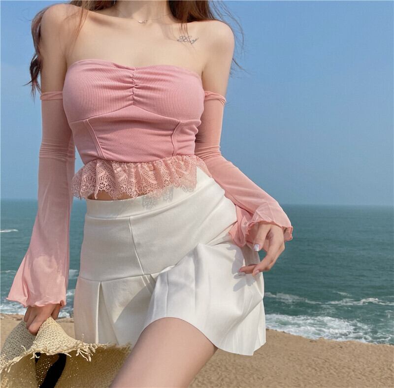 レースTシャツ夏服韓国ファッションスリム薄手ショートトップス ロング 夏物 ステッチ スタイル 長袖 YY74009417917