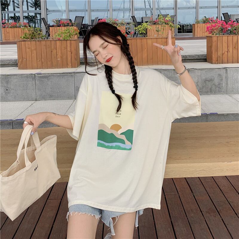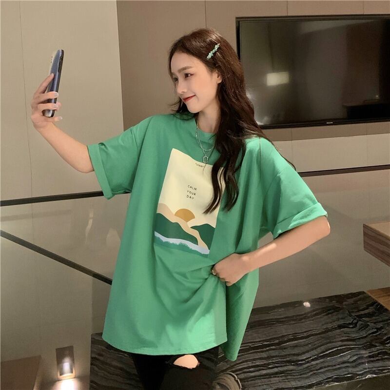 ラウンドネックTシャツレディース夏服ルーズプリント柄トレンド 夏物 Oネック ミドル丈 YY38261967600