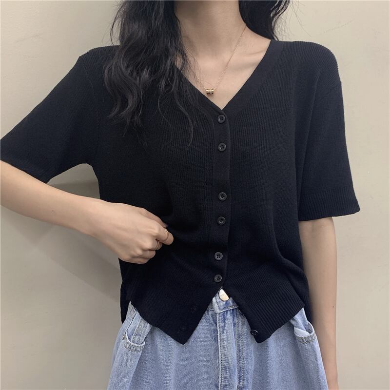スタンダードクロップドトップス 夏服Vネックブラックニットカーディガン レトロ 夏物 SYJ95784027381