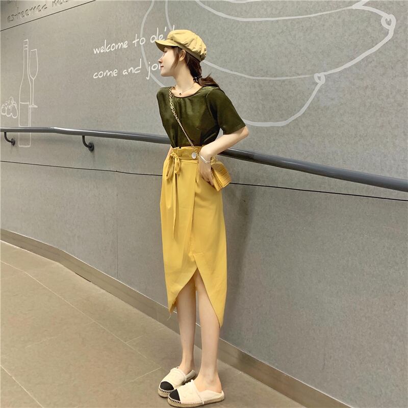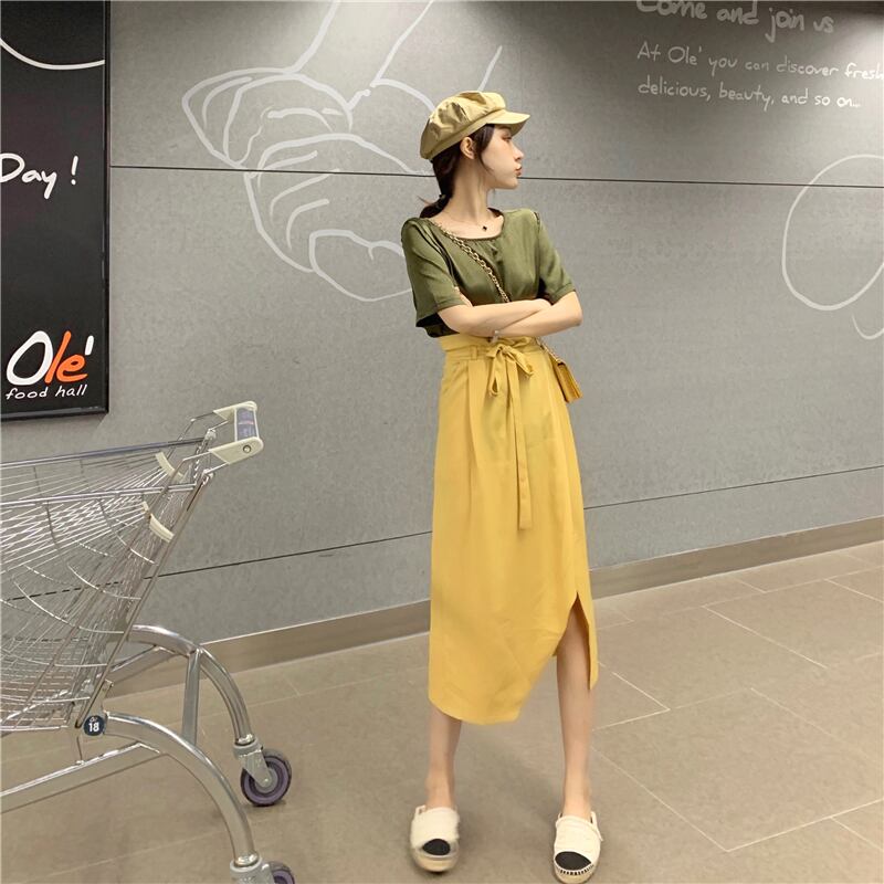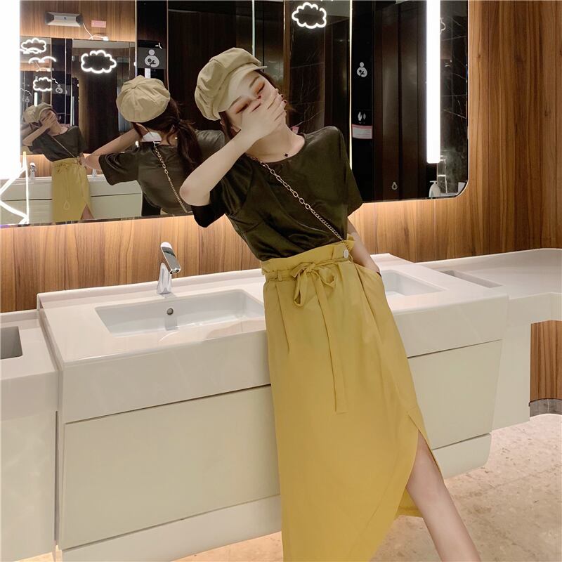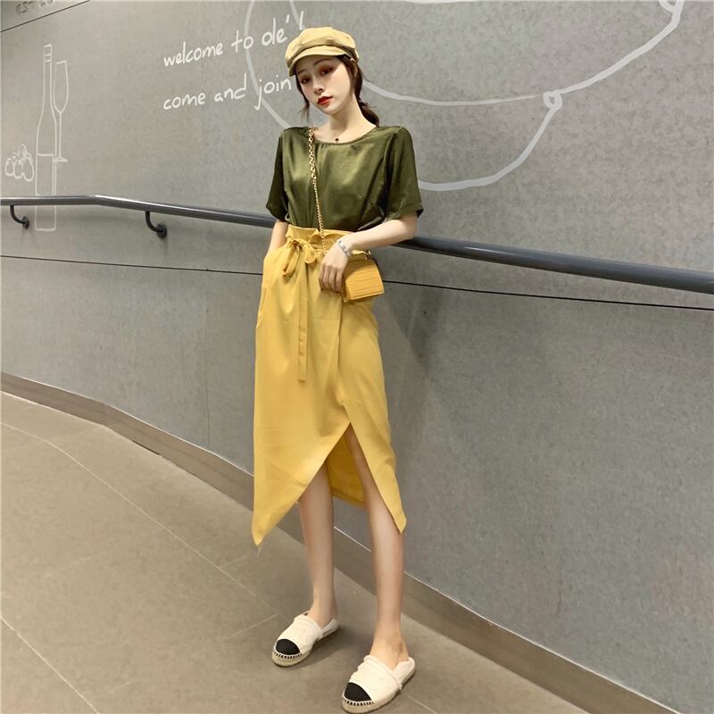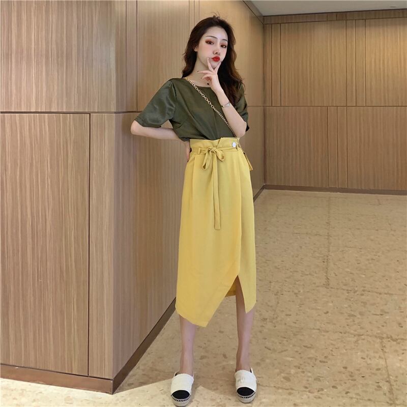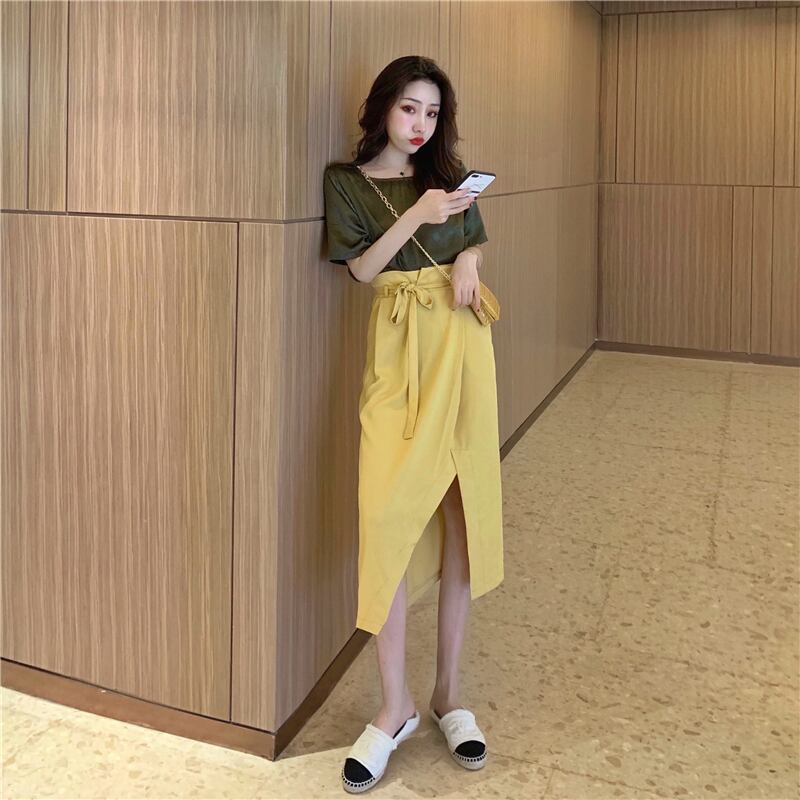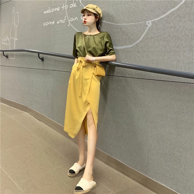 サテンソリッド カラーTシャツスカート 夏服 夏物 ソリッドカラー ミドル丈 YY17291521222