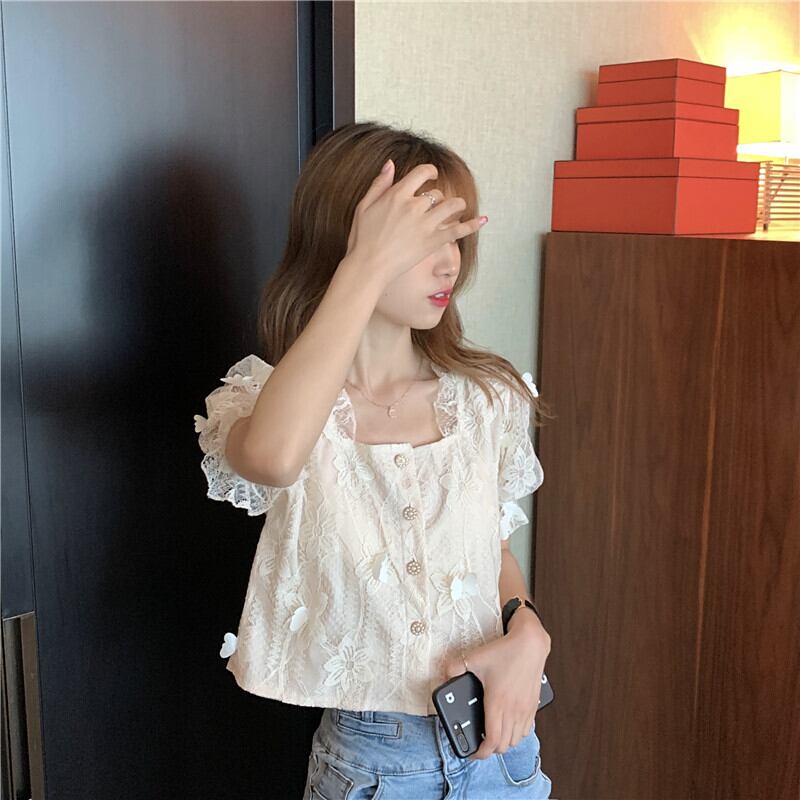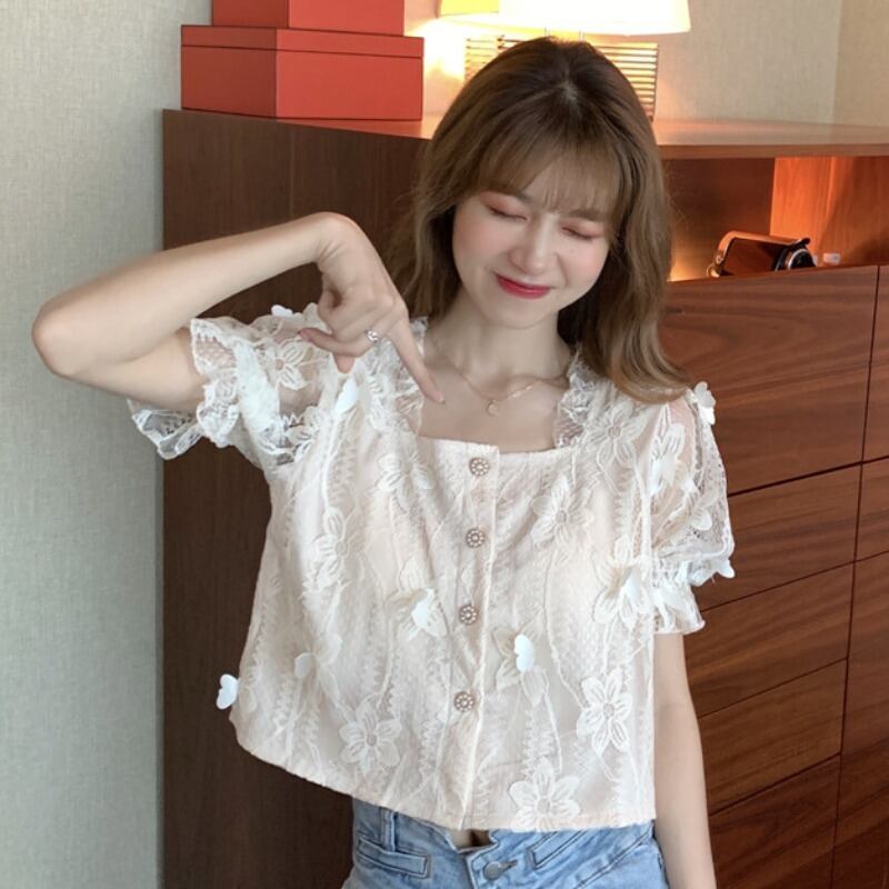 スタイルレースシャツ レディース夏服スタンダードカラースリーブショートトップス ランタンスリーブ レトロ 夏物 スクウェア YY95548984533