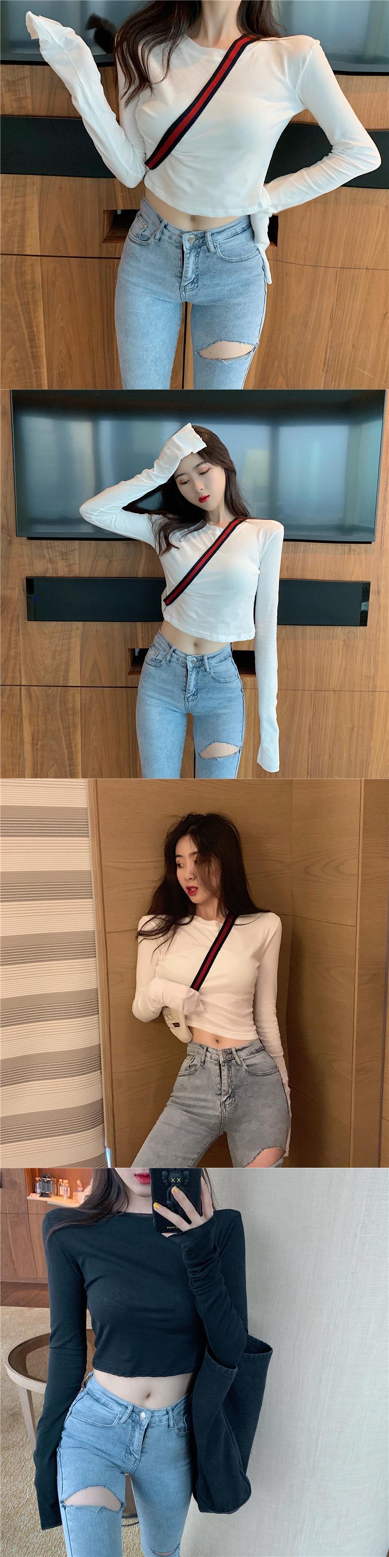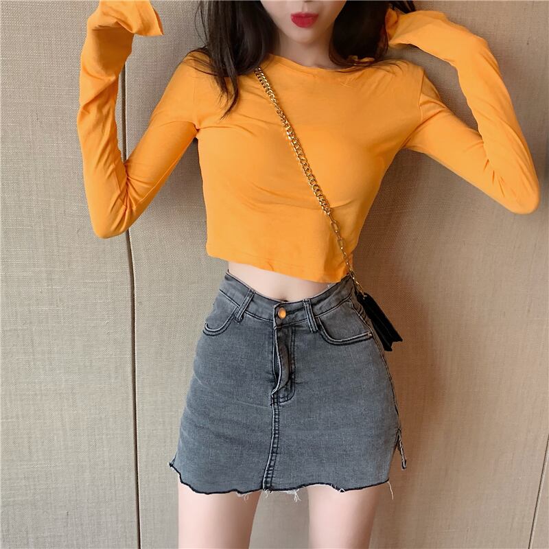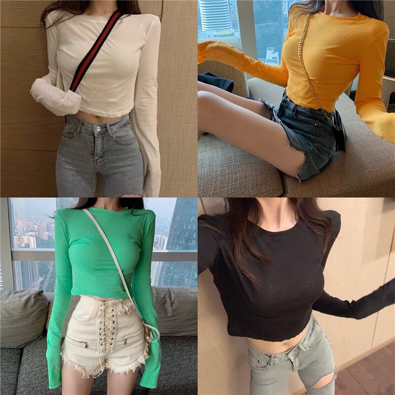 スプリング秋物韓国ファッションブラウス スリムブラックショートTシャツ ロング 春物 オータム スタイル 長袖 YY55960327629