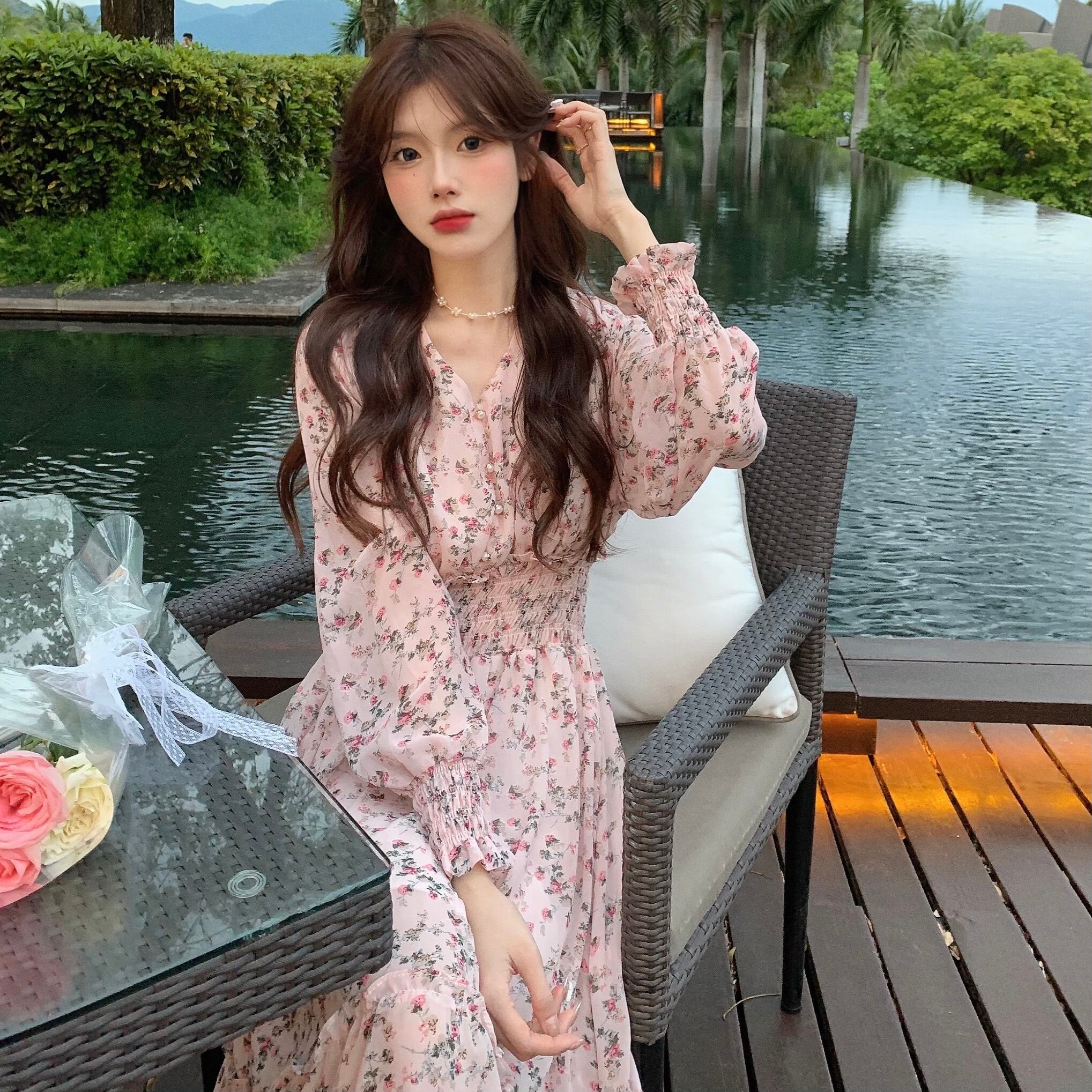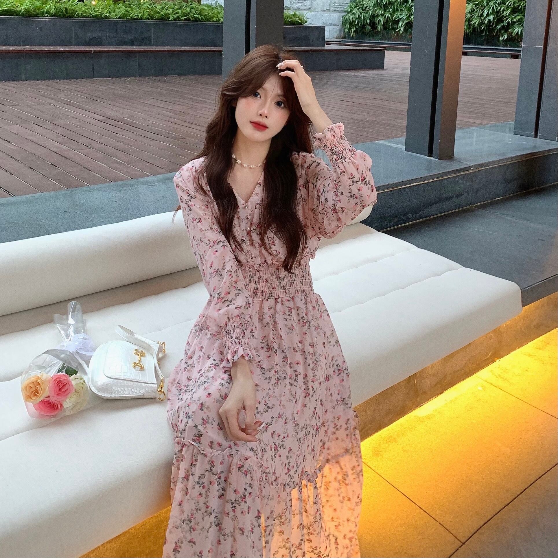 フローラルロングワンピースレディーススプリング秋物ウェストスカート 春物 オータム 花柄 長袖 ウエスト SYJ24131269379