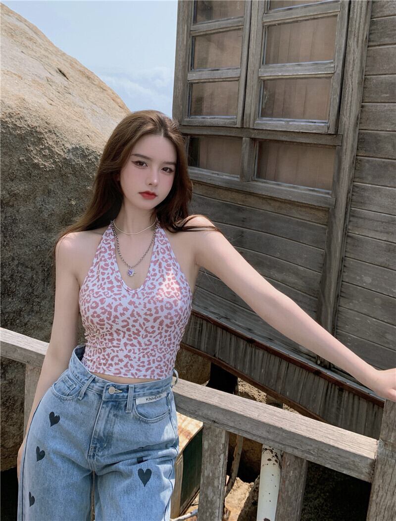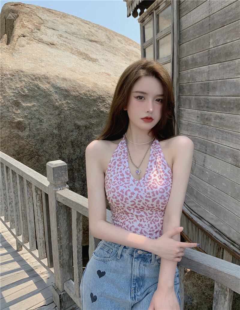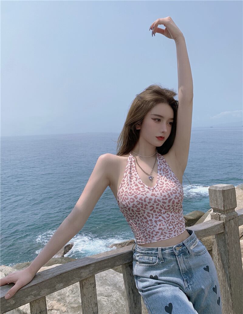 スタンダードレオパードプリント柄ホルターレディース夏服スリムショートバックトップス レトロ 夏物 YY59465022766