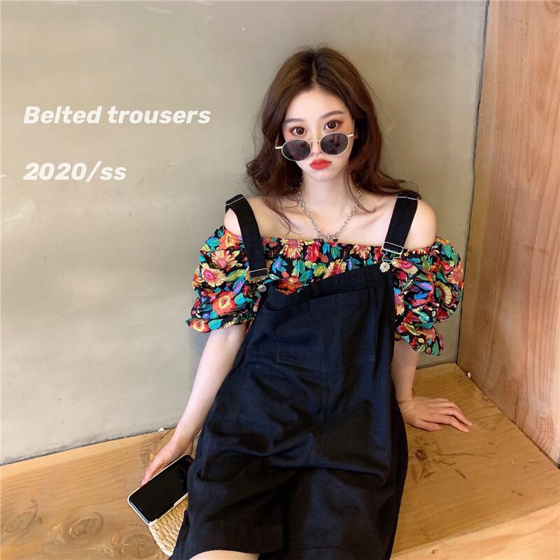 色:黒ひまわりトップ,ピンクひまわりトップ,ストラップハーフパンツ,ストラップズボン