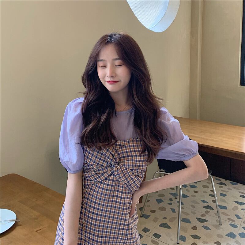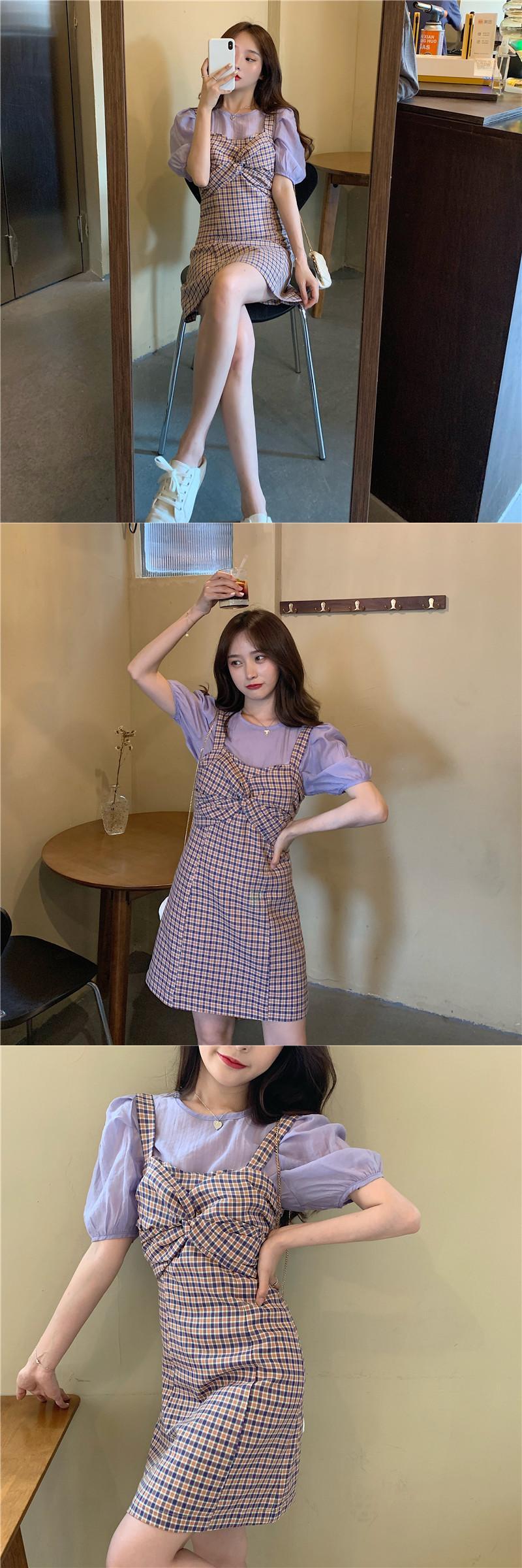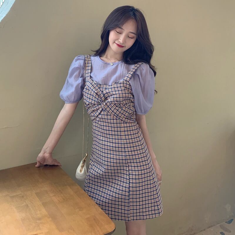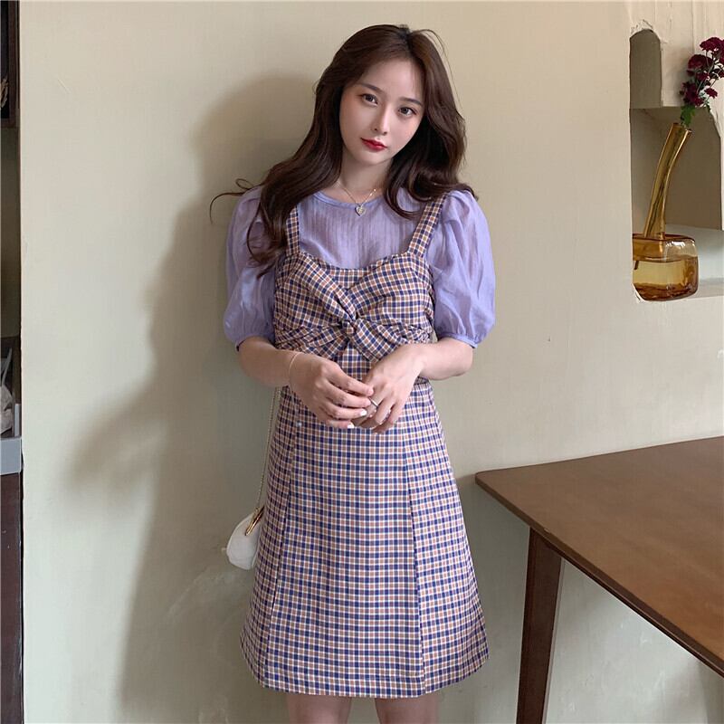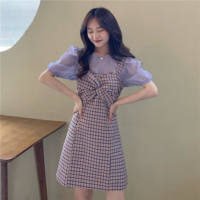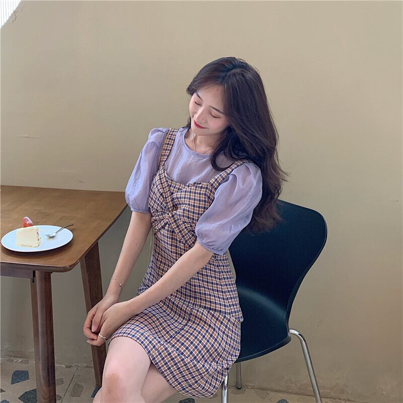夏服スリーブ格子柄ワンピース 大人ガーリー スウィート キュート カジュアル 夏物 YY88889976824