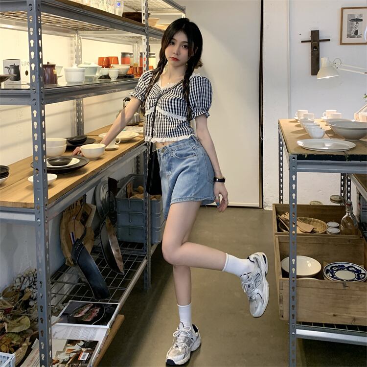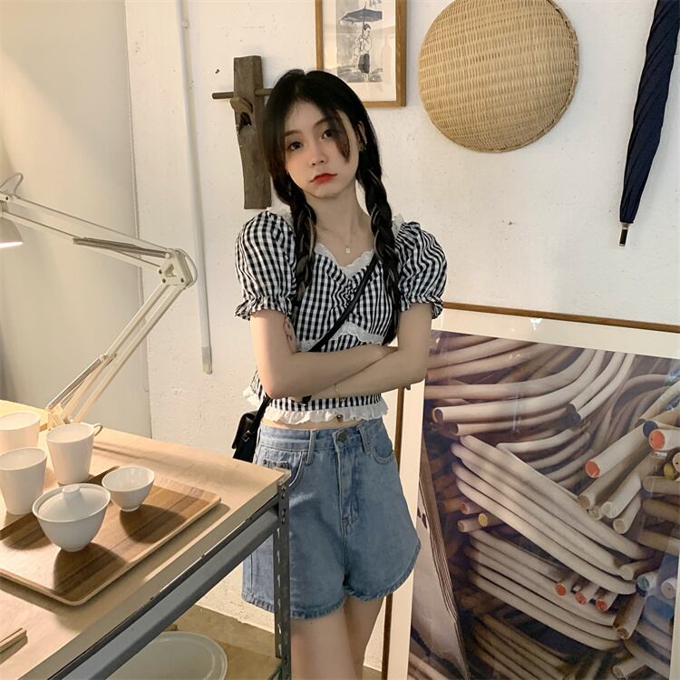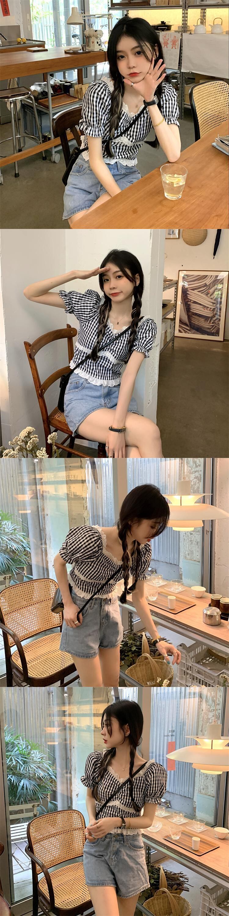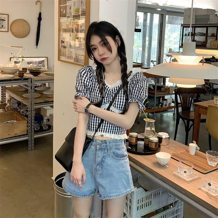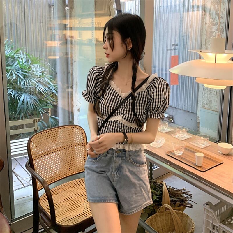 スタイルシャツ 夏服レディーススリムレース格子柄トップス 夏物 MONROE77387941014