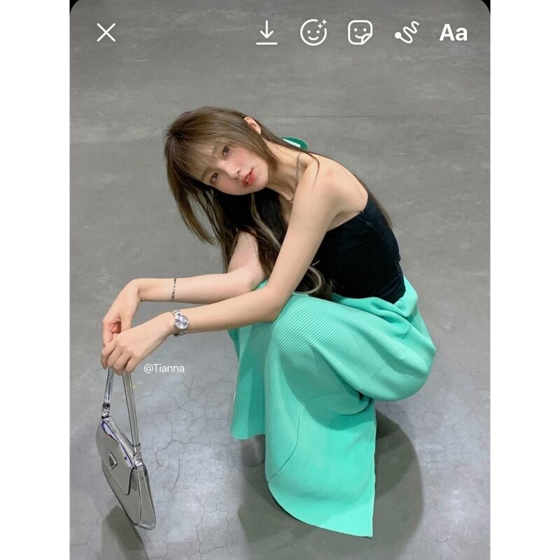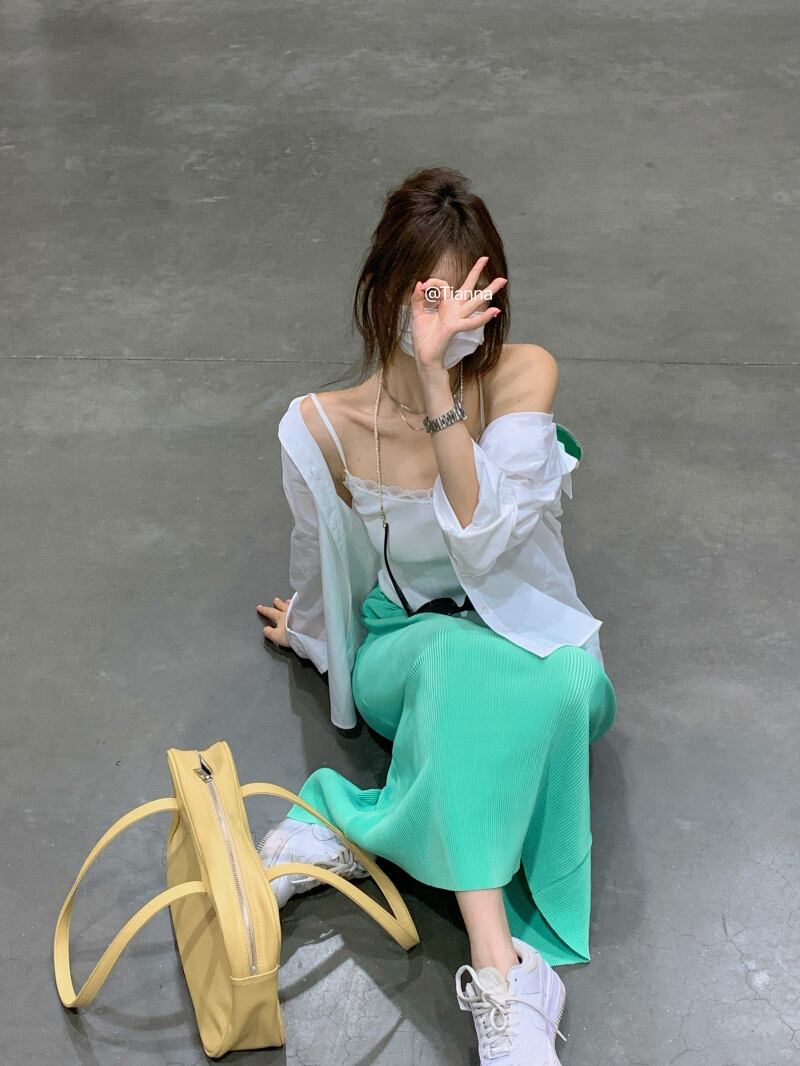色:白のシャツ,ホワイトサスペンダー,緑のスカート