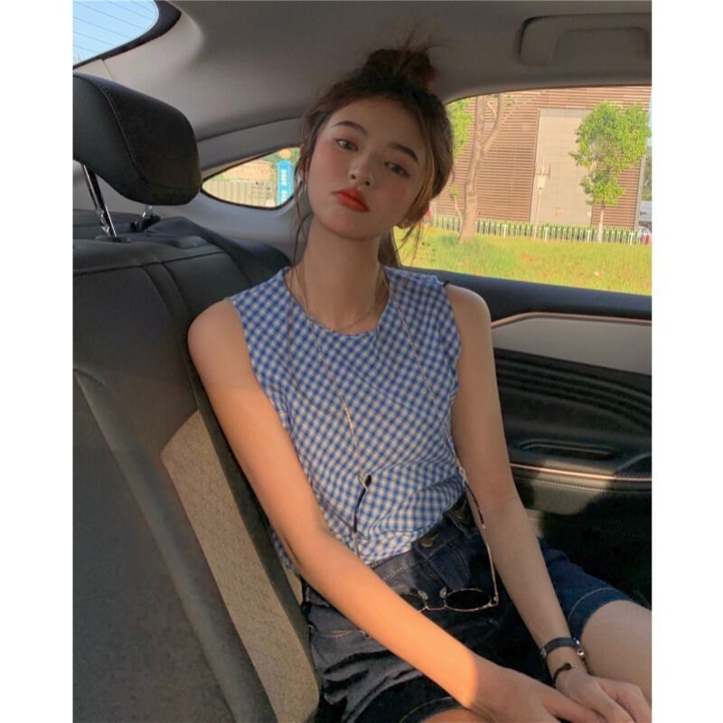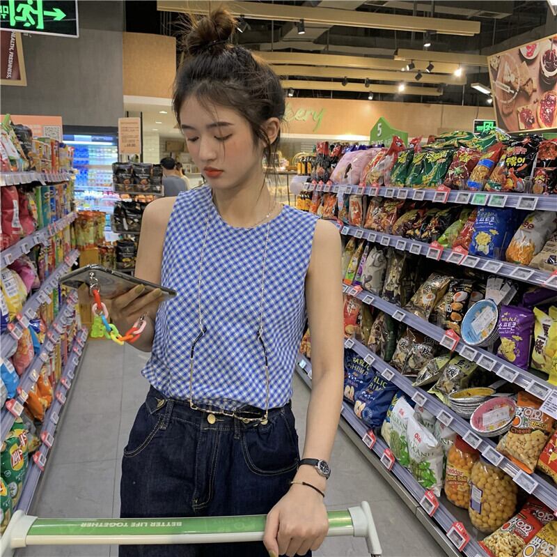 ブルー格子柄ノースリーブTシャツレディース夏服ルーズ薄手トレンド 夏物 MONROE6579556710