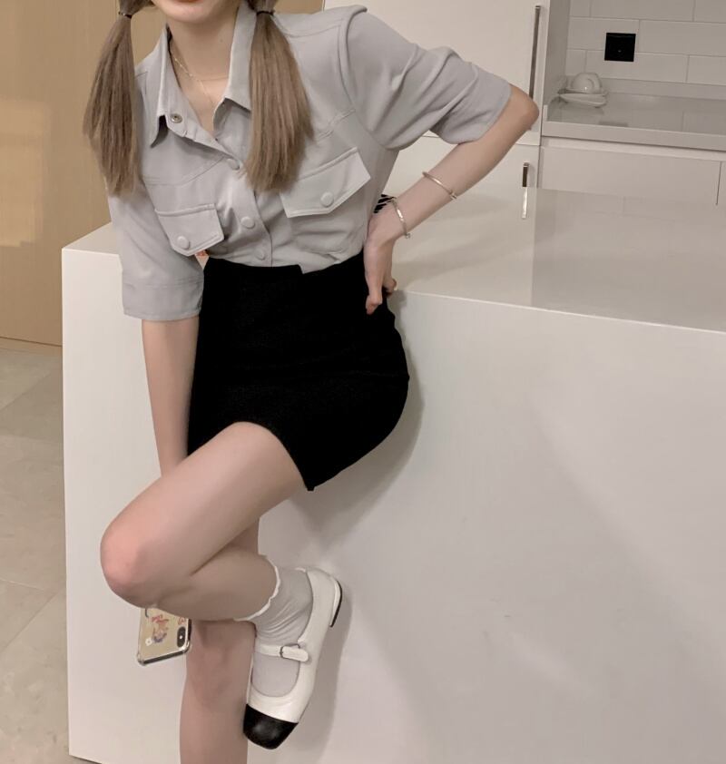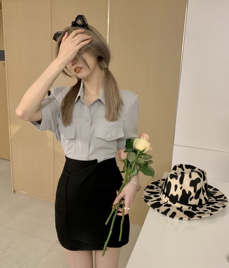 色:グレーのシャツ{ネクタイを含む},黒スカート