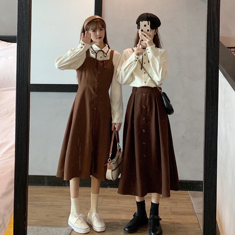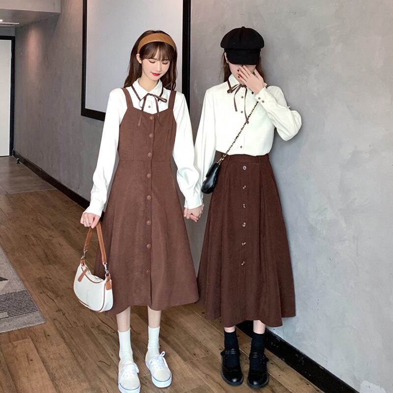 色:オフホワイトシャツシングル,茶色のスカートワンピース,ストラップワンピース