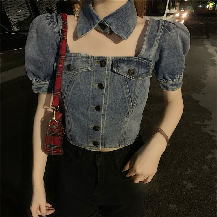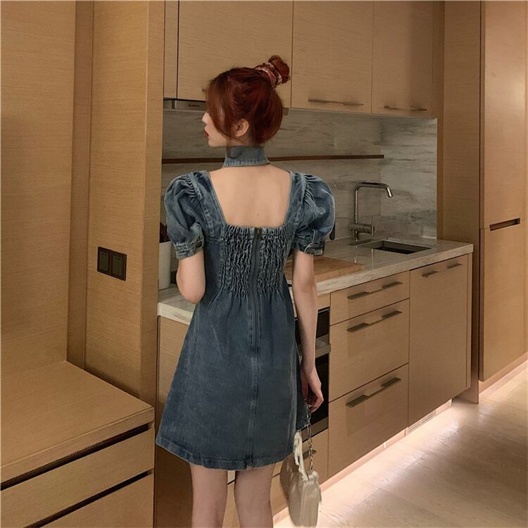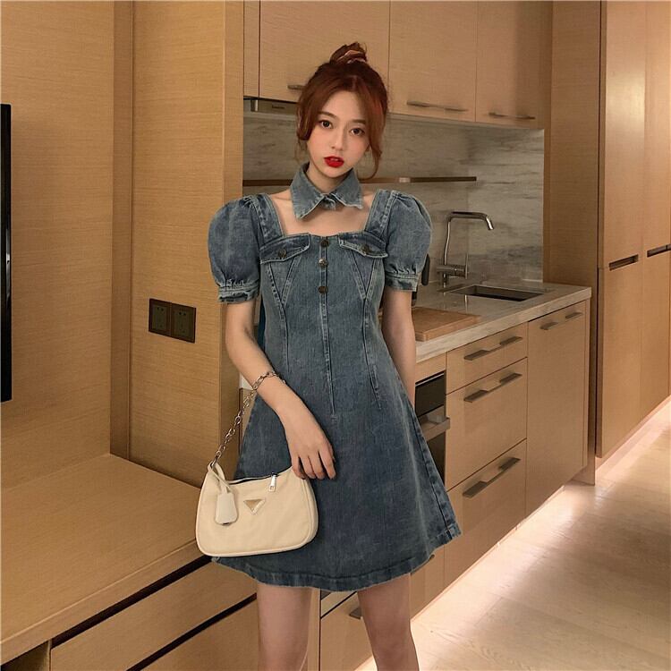 デニムワンピーストップスシャツスプリング春夏Aライン薄手パフスリーブレディースショートスカートレトロ 春物 SYJ22139754420