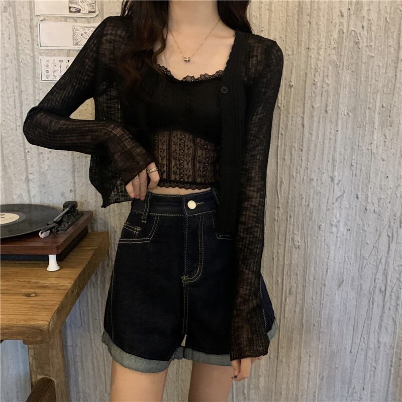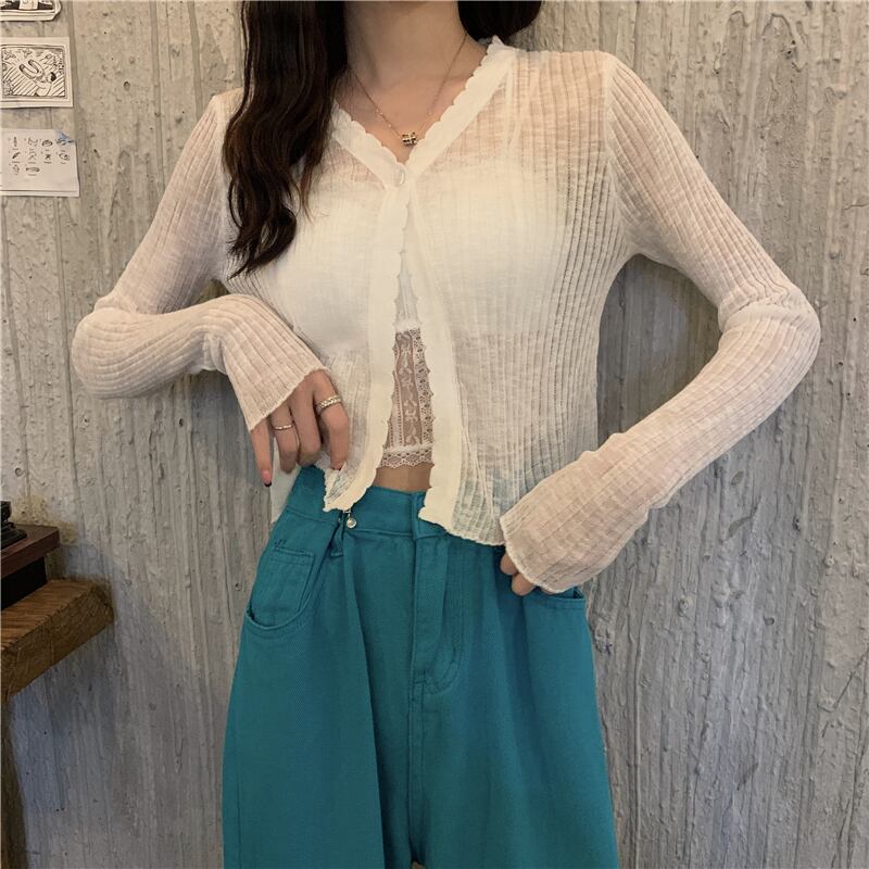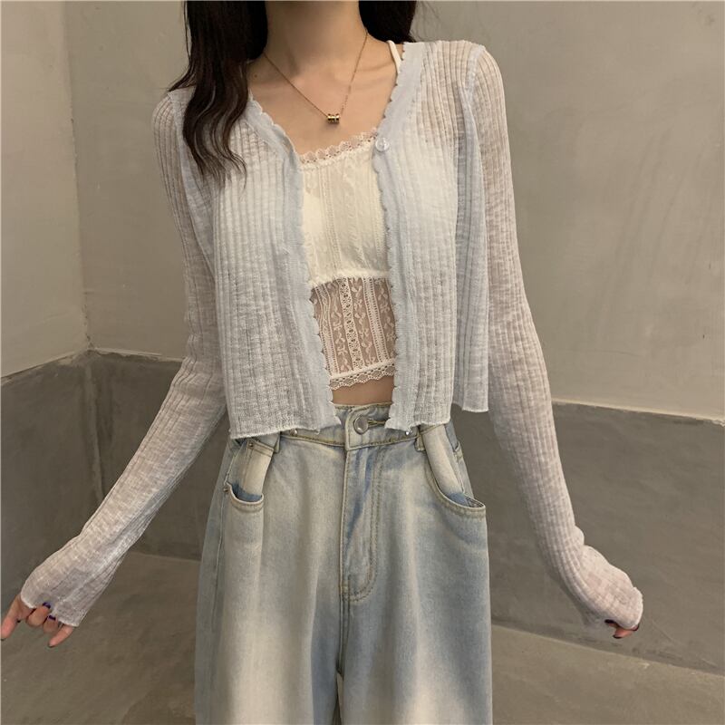 ニットセーター レディース夏服Vネックショートカーディガンホワイトスリムトップス ロング 夏物 長袖 YY96249772314