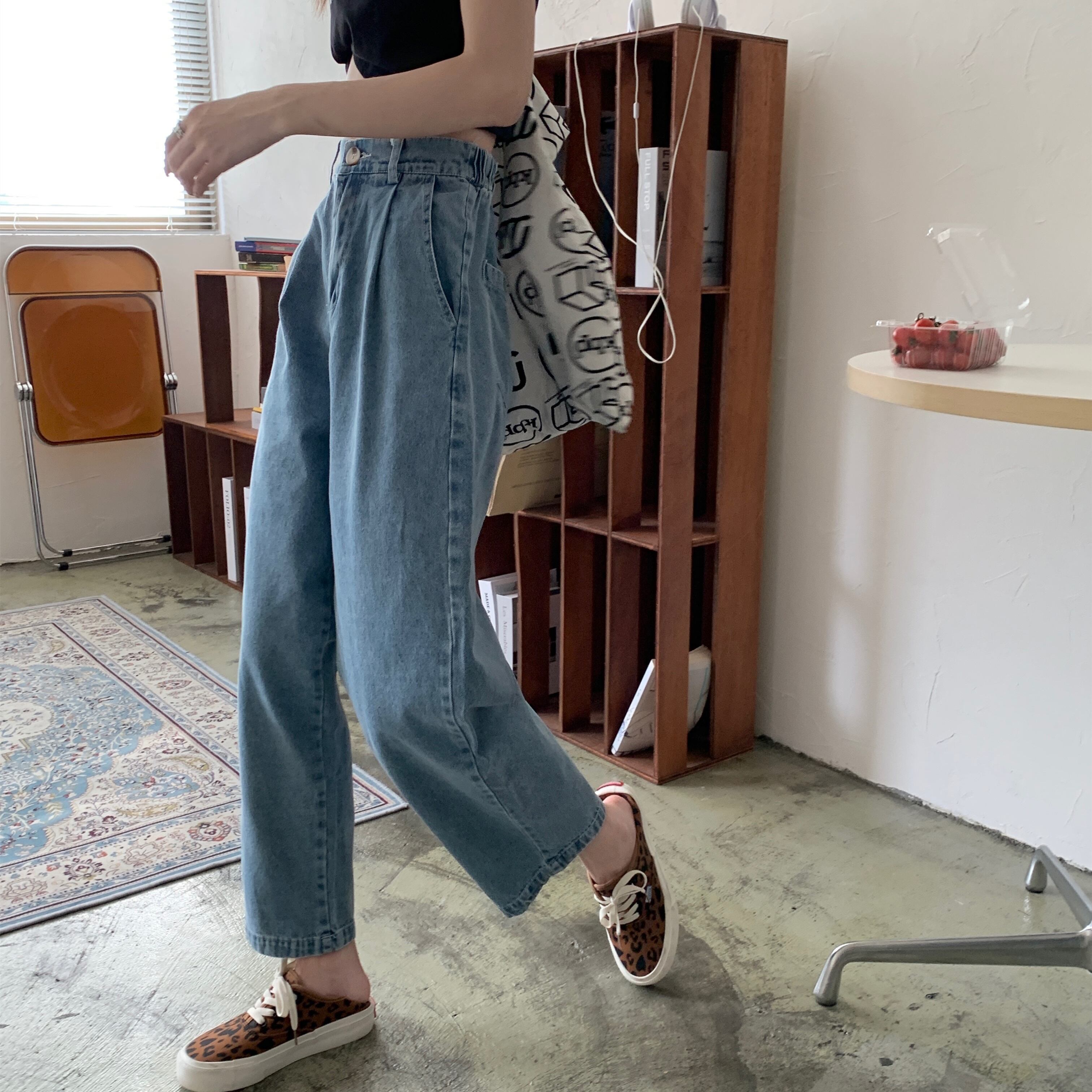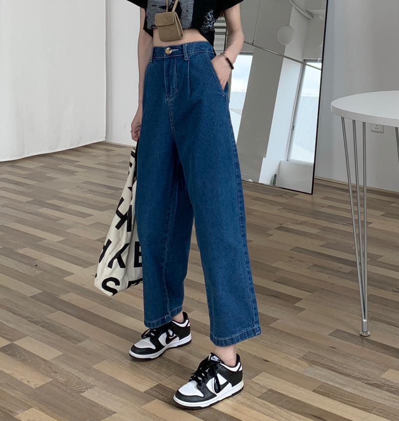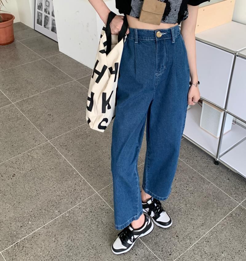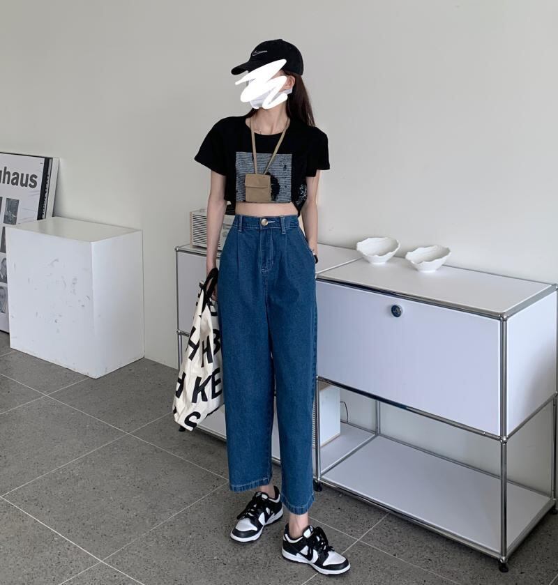 夏服薄手ダークブルー韓国ファッションストレッチウェストルーズパンツ ジーンズ エラスティック 伸縮 夏物 スタイル ウエスト YY59673403749