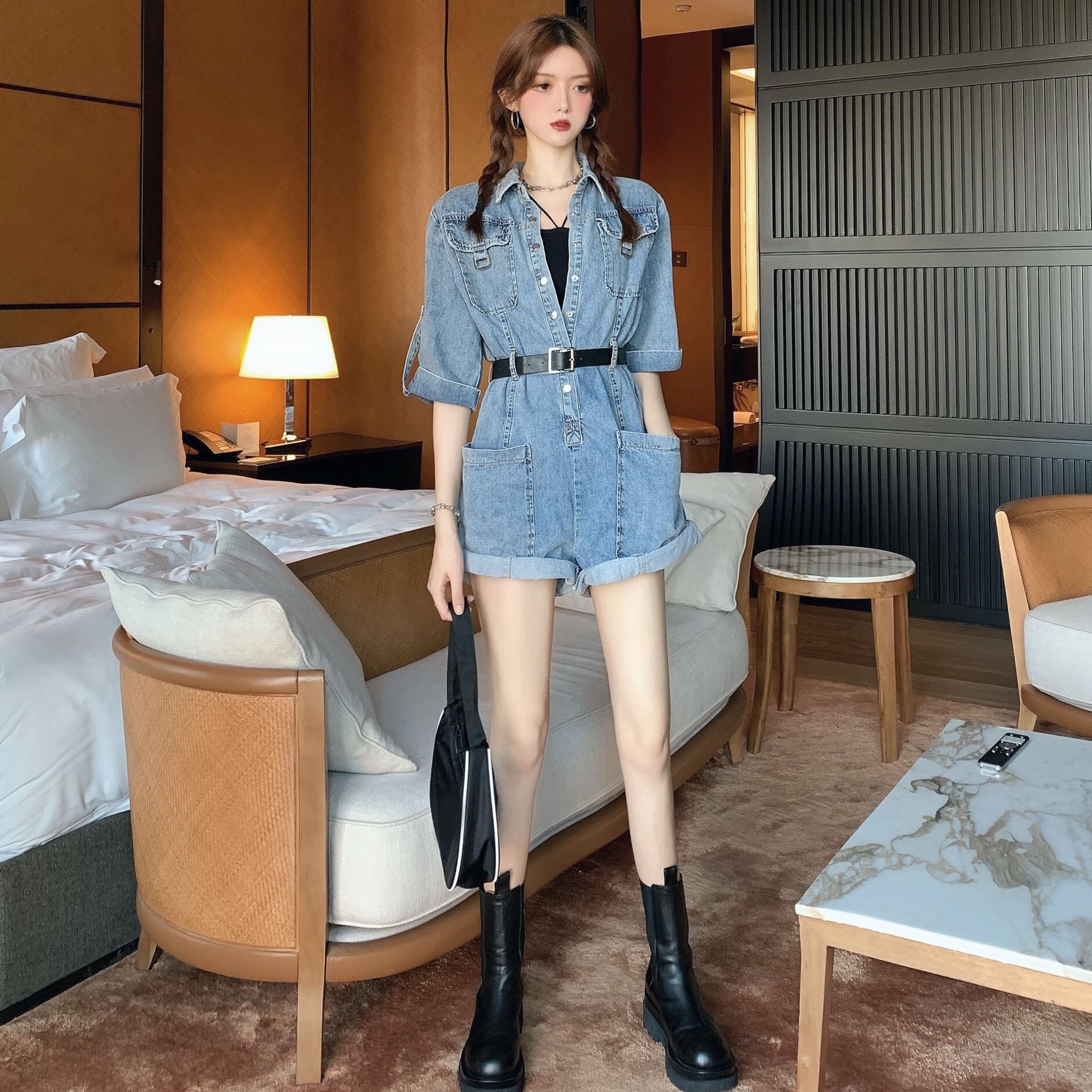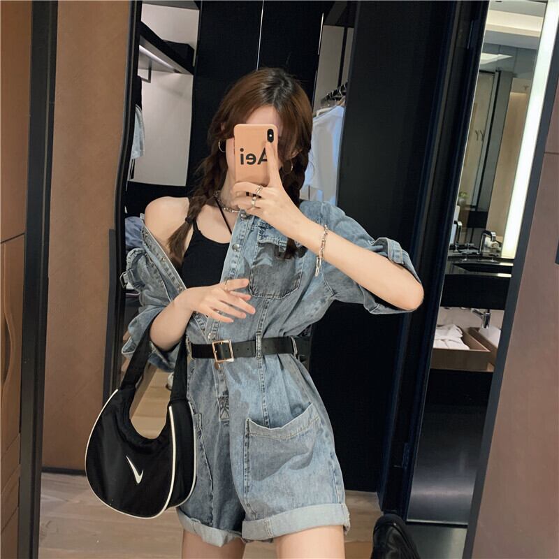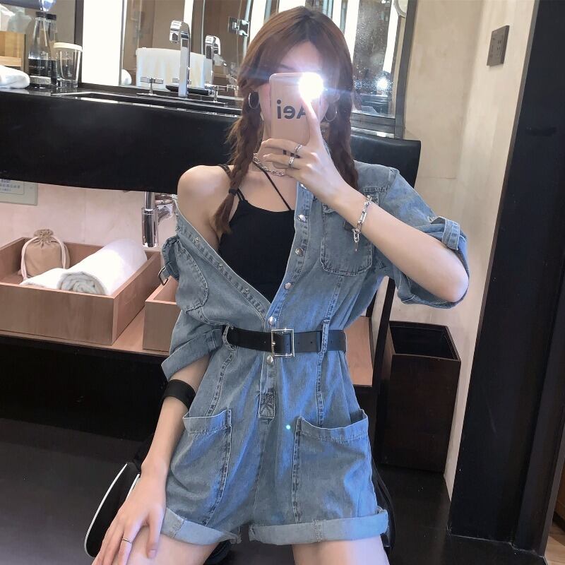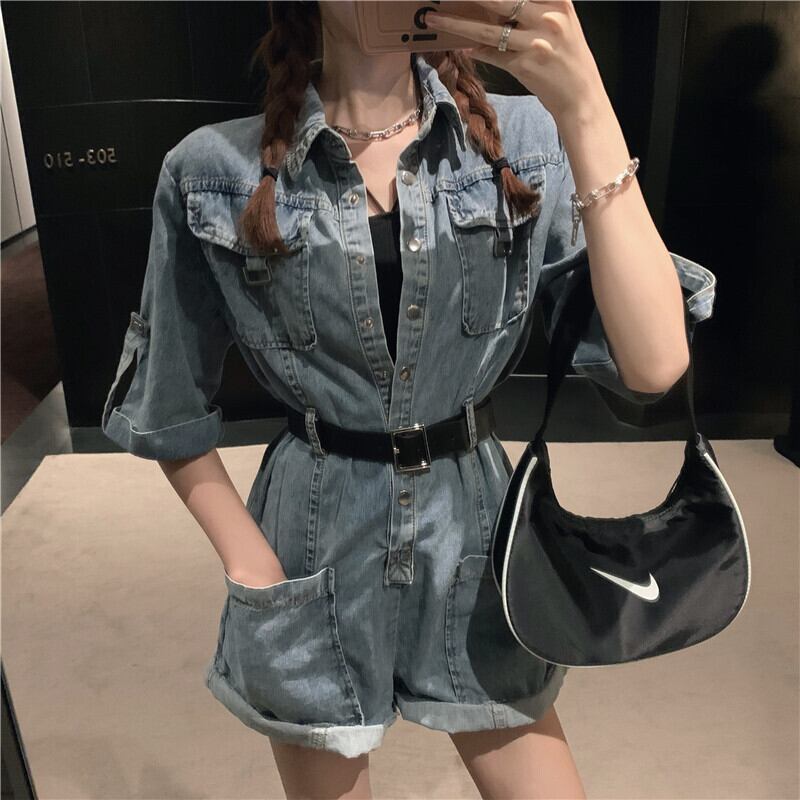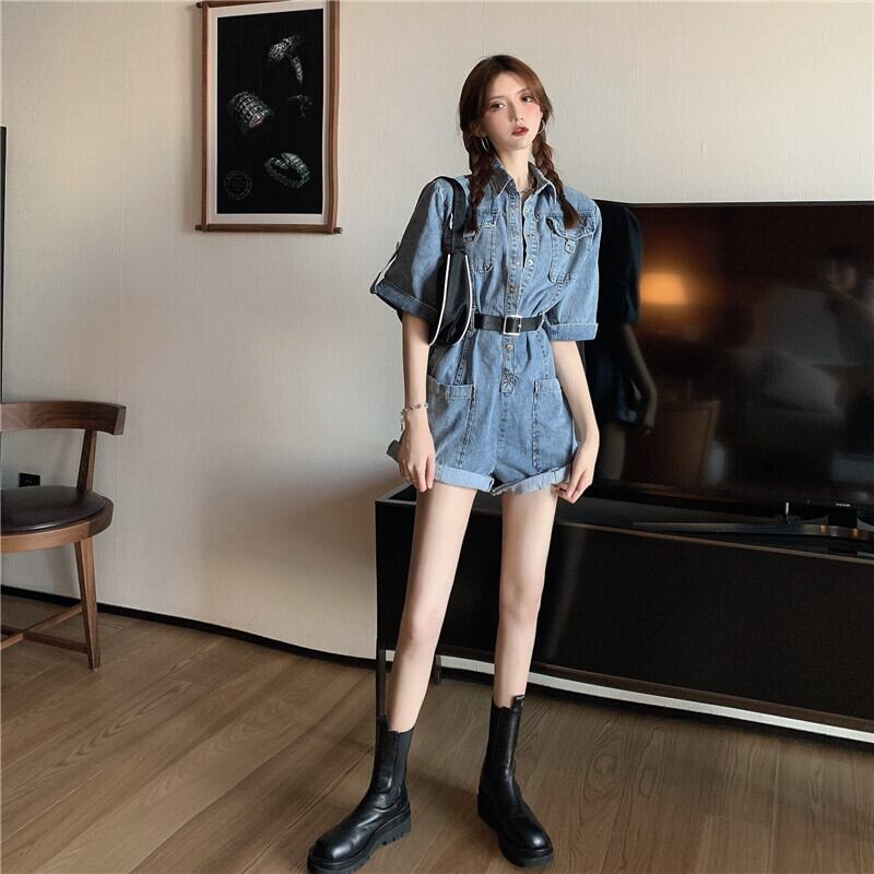 オールインワンレディースパンツデニム夏服スタイルジャンプスーツ襟付きハイウェストウェストスリム レトロ 夏物 ウエスト YY93775257725