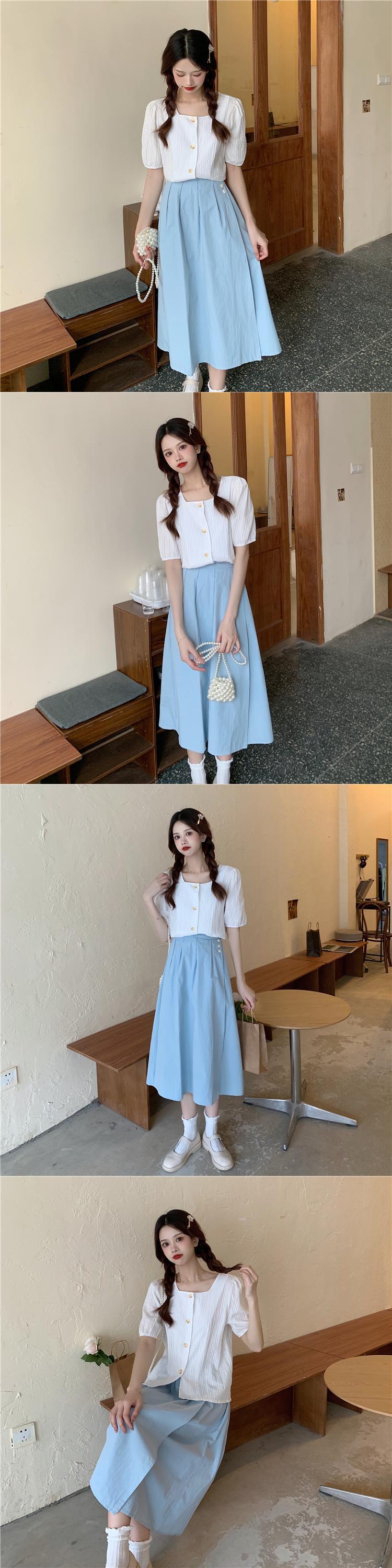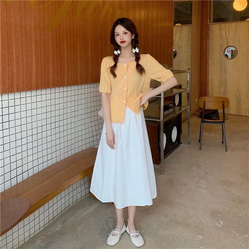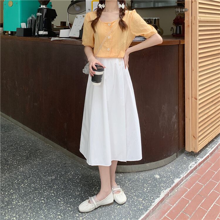 色:アプリコットシャツ,オレンジ色のシャツ,白のシャツ,黄色のスカート,白いスカート,青いスカート