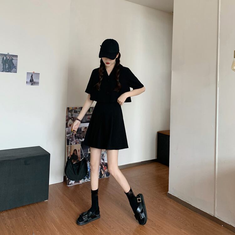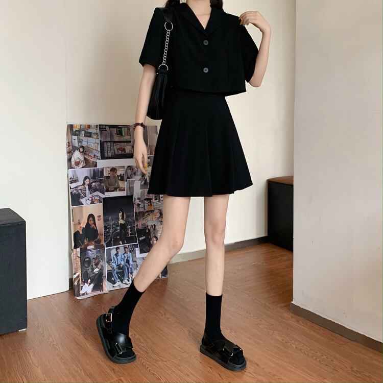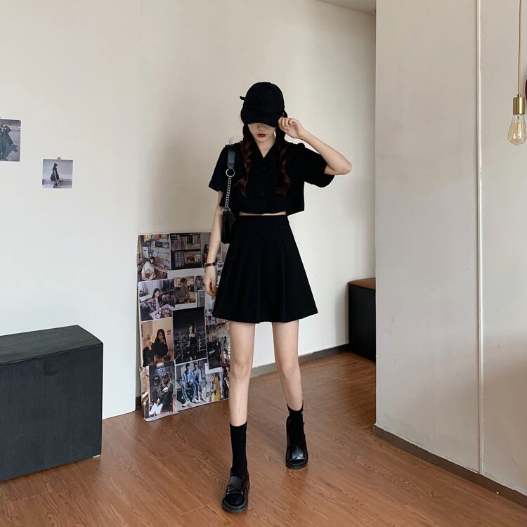 夏服ハイウェストウェストAラインプリーツスカート ブラックショートブラウス レディース 夏物 ウエスト YY71819300833