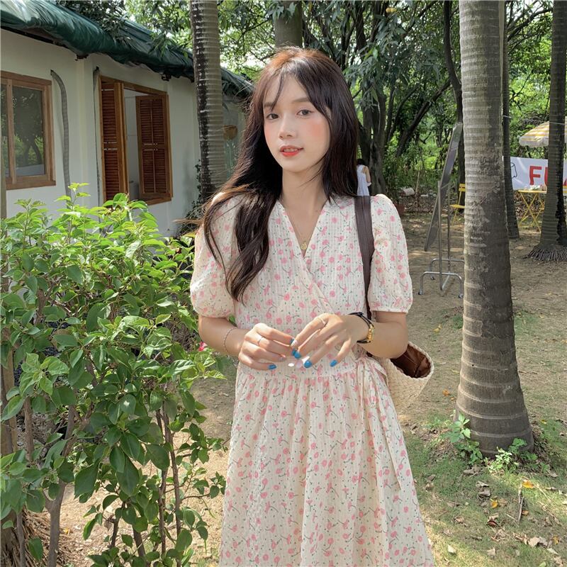 ワンピース夏服スタンダードウェストVネックフローラルスカート レトロ 夏物 花柄 ウエスト ミドル丈 ワンナンバー72295814788