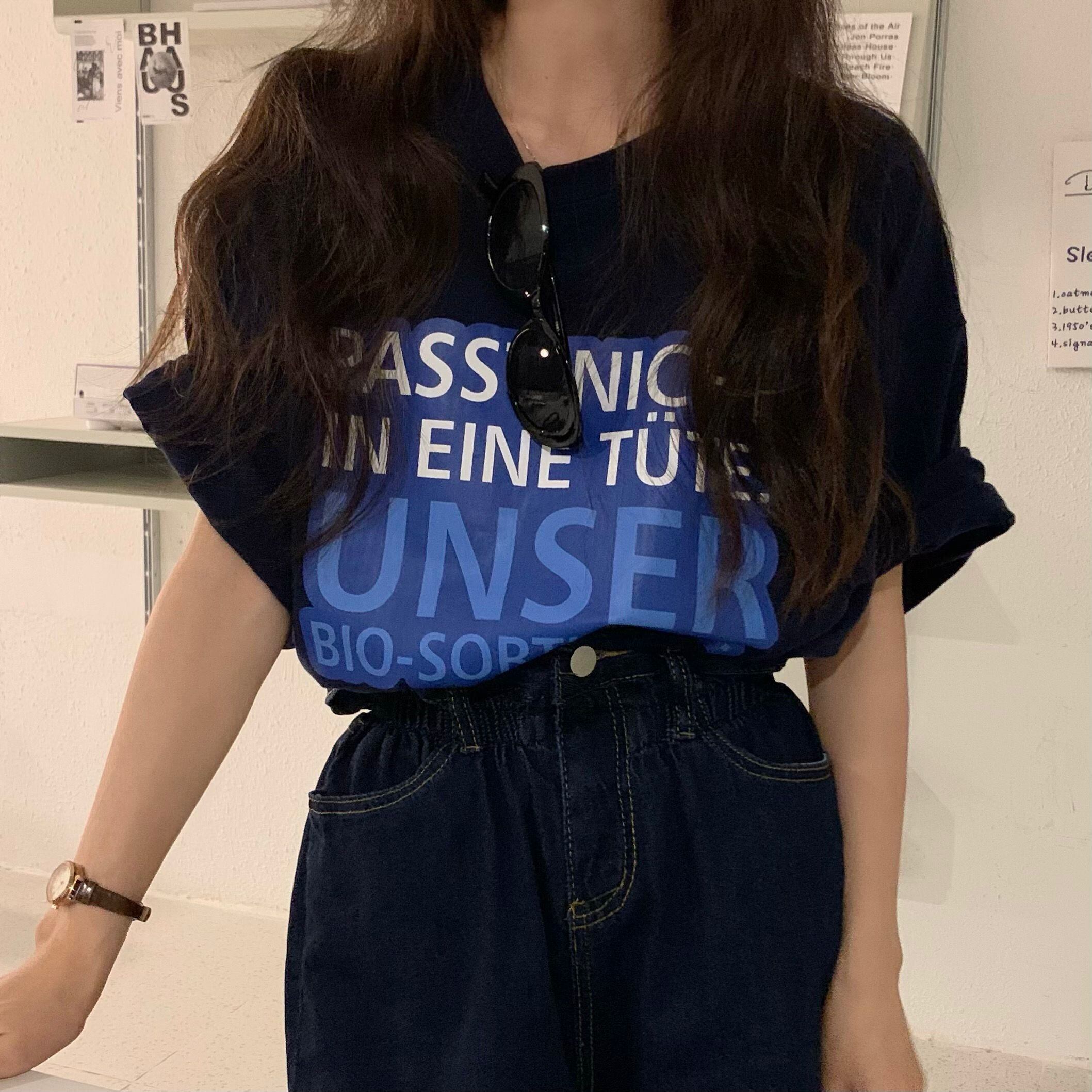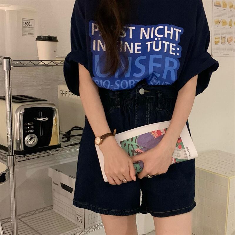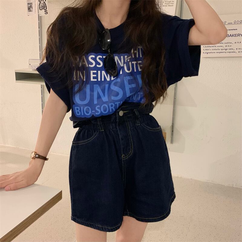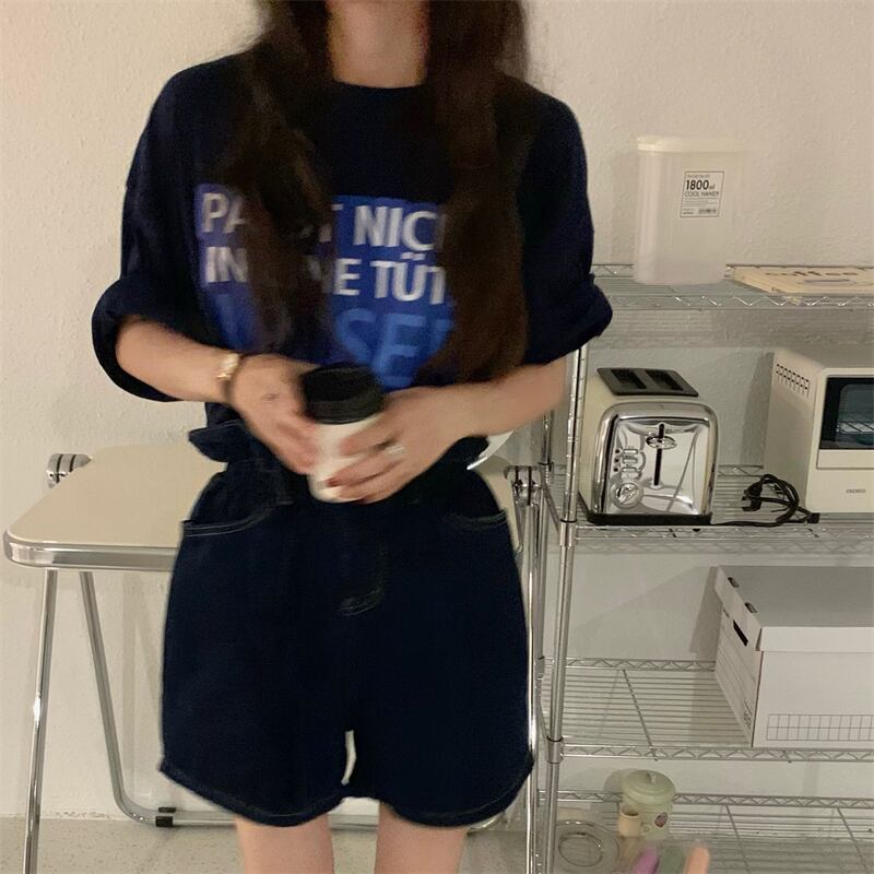 色:ネイビー半袖Tシャツ,ダークブルーデニムショーツ