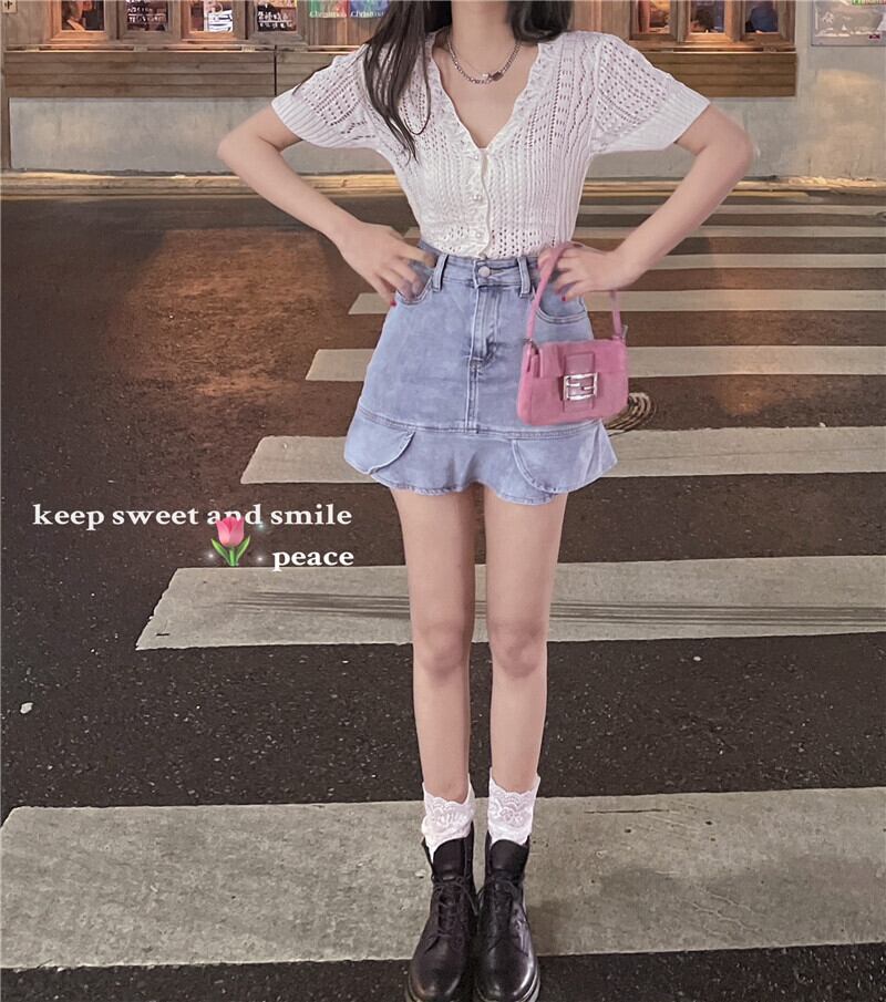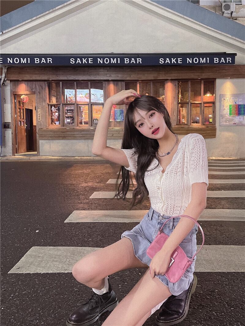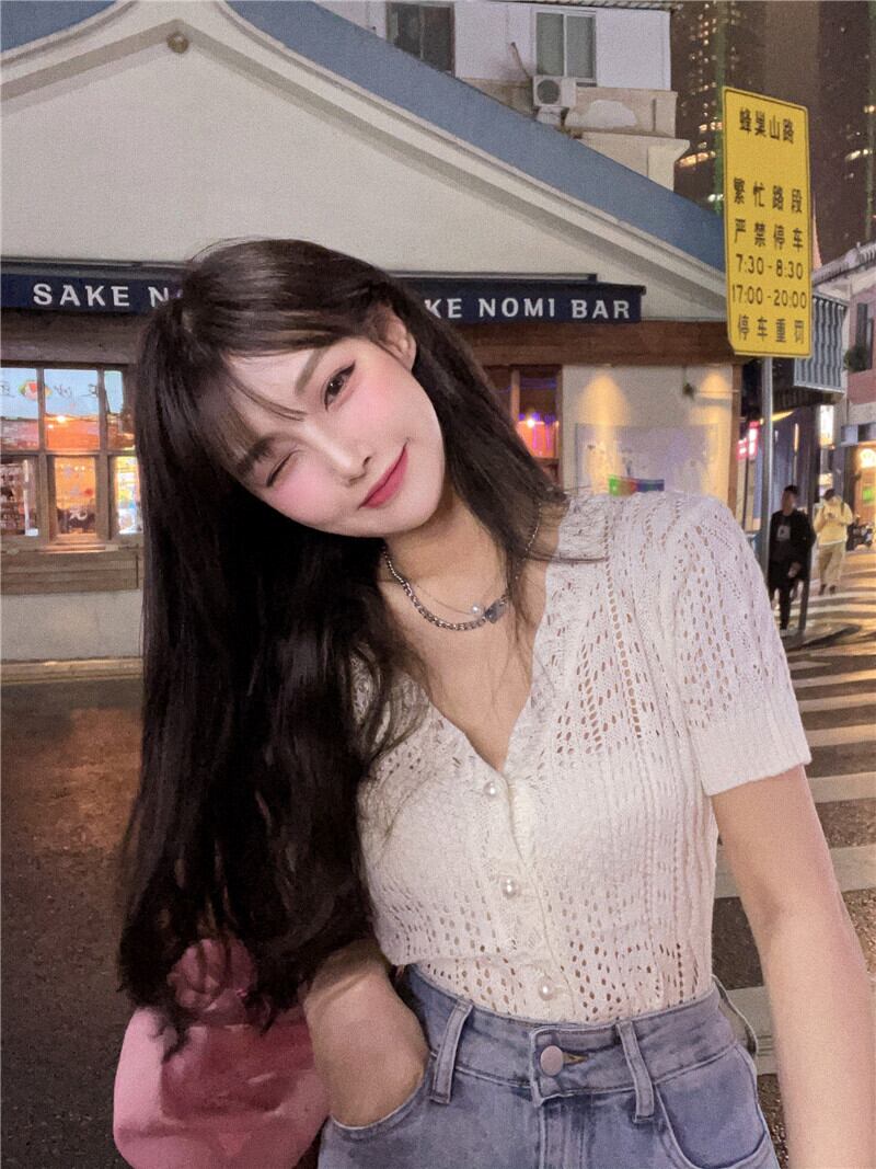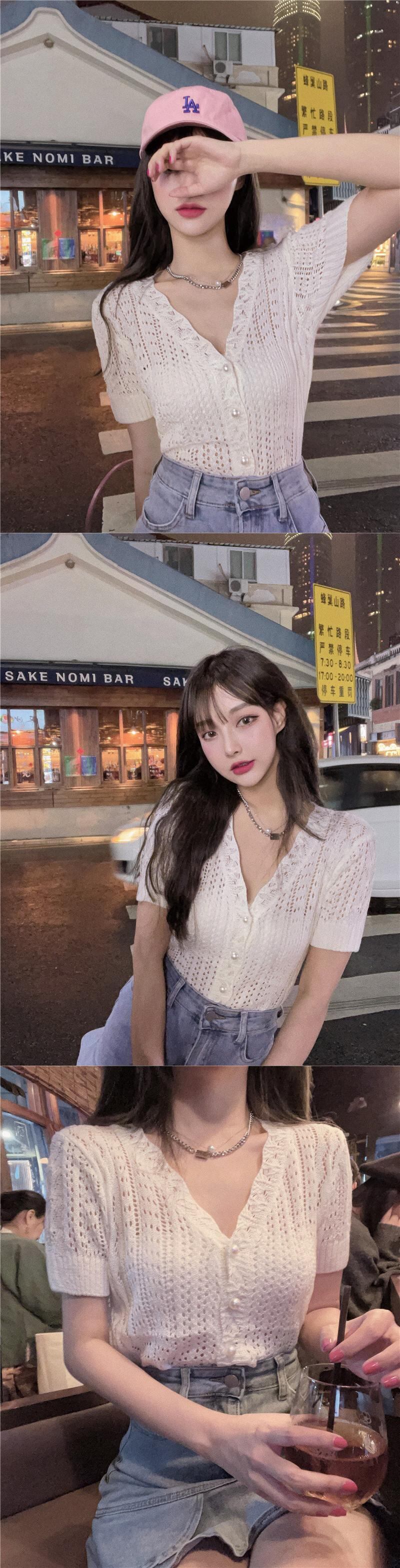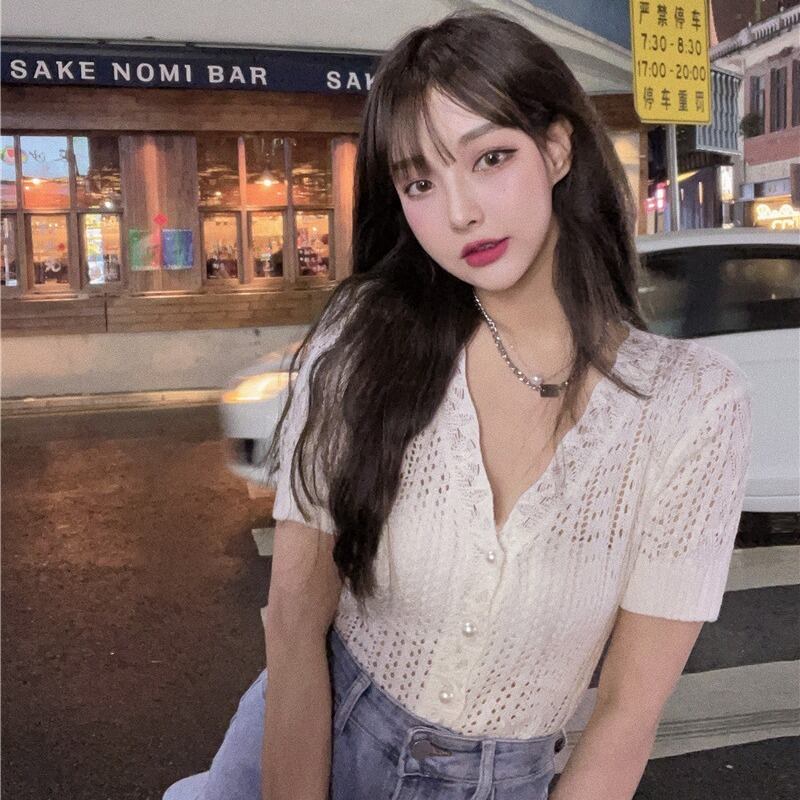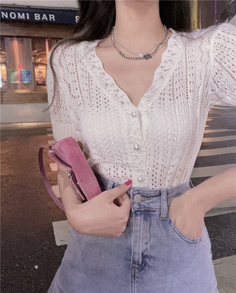 レースニットカーディガン夏服薄手スタイルVネックショートTシャツホワイトトップス 夏物 YY75224302663