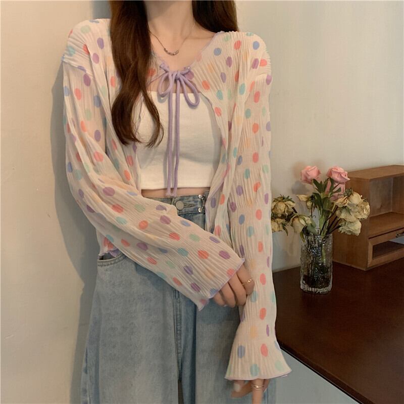 夏服韓国ファッションルーズ薄手カーディガンシフォンシャツ レディース水玉トップス ロング 夏物 スタイル 長袖 YY24026972681