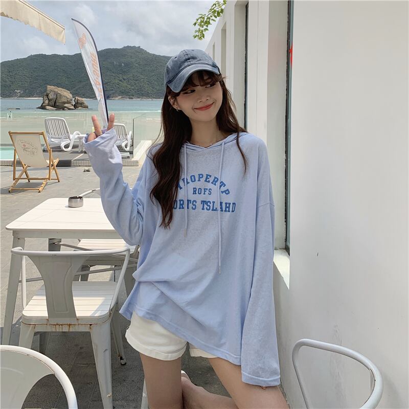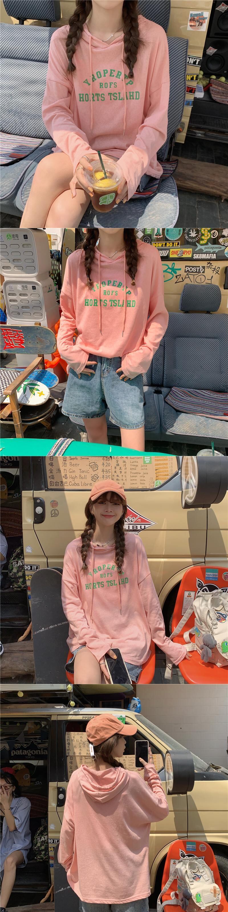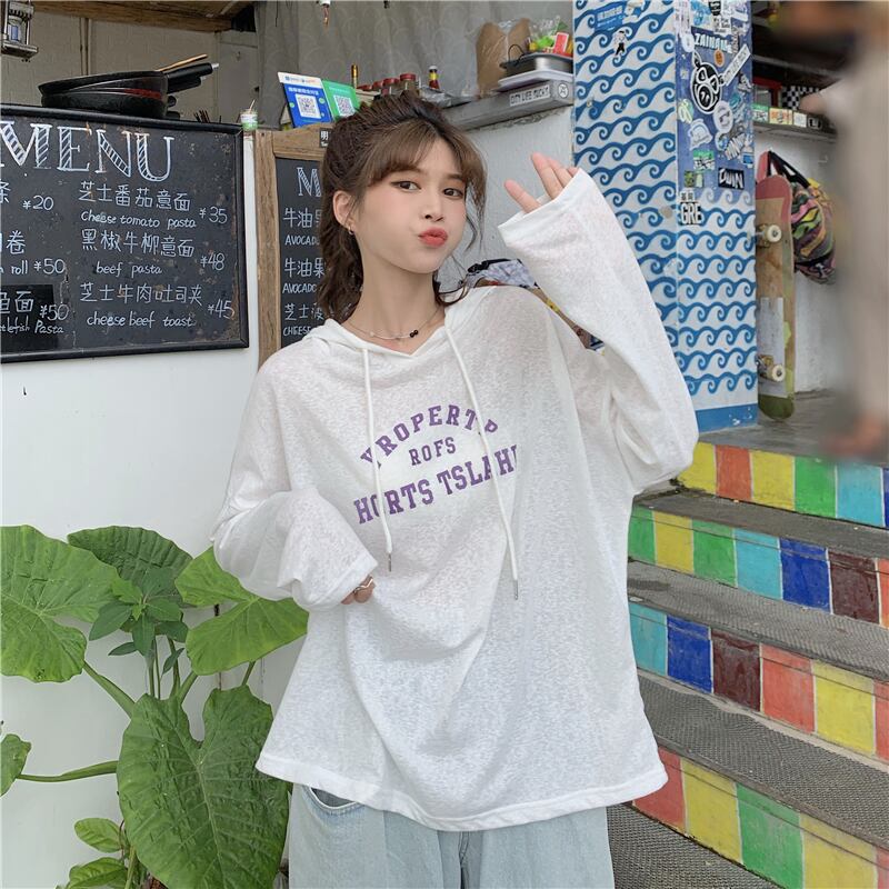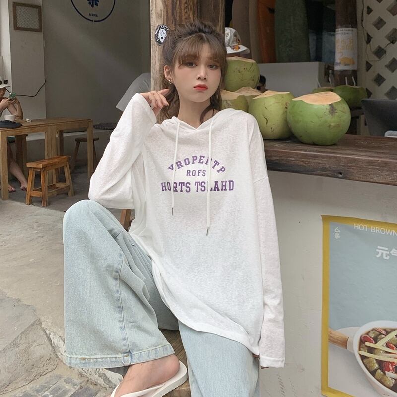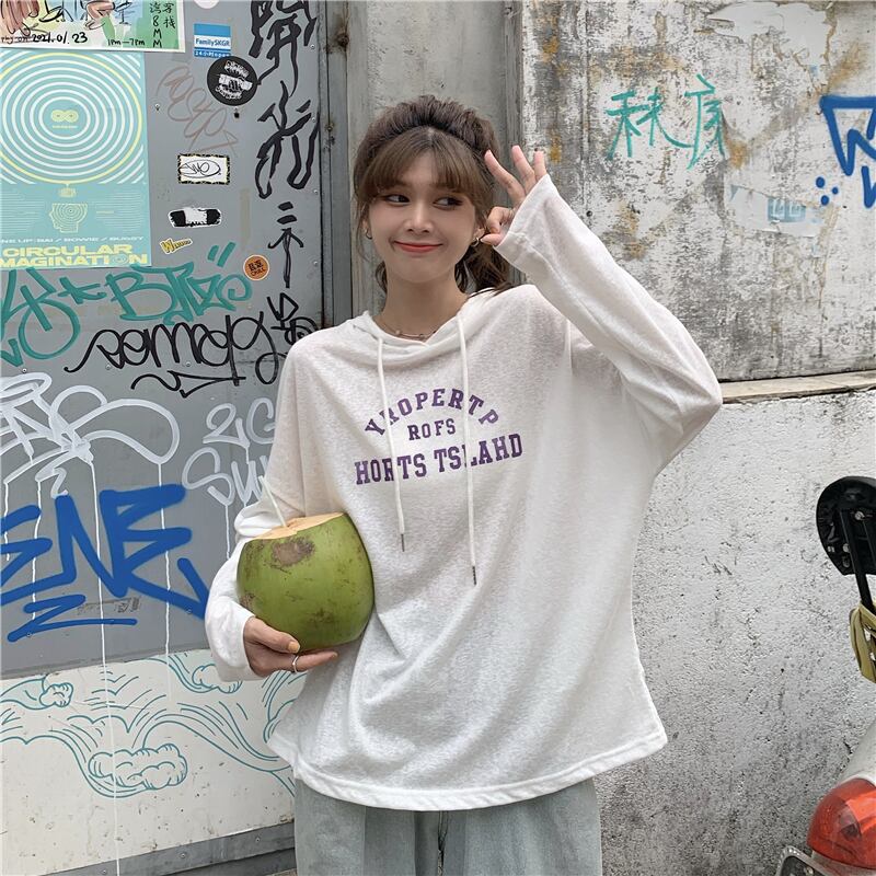 夏服韓国ファッションルーズ薄手フードTシャツトップス レディース ロング 夏物 スタイル 長袖 ミドル丈 YY10663056018