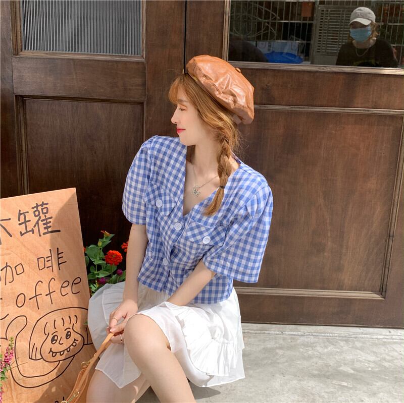 スリーブ格子柄シャツ レディース夏服ハイウェストウェストプリーツスカート ストリート 大人ガーリー スウィート キュート カジュアル 夏物 ウエスト YY48085994519