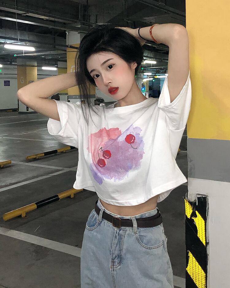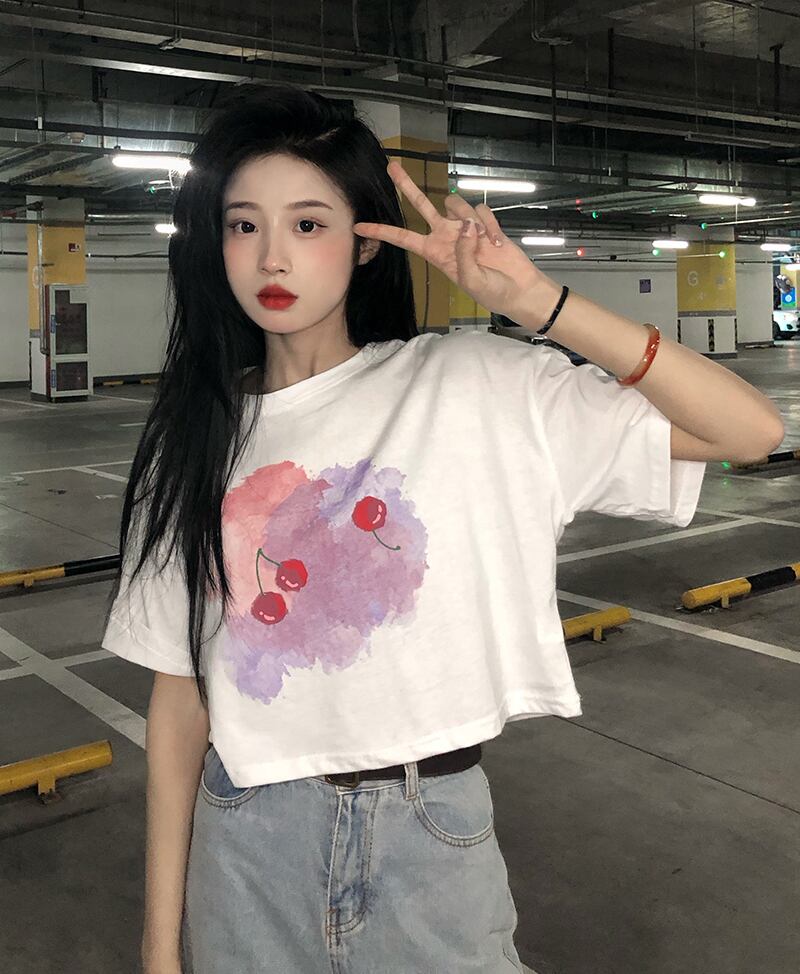 プリントホワイトショートTシャツ薄手夏服トップス 夏物 YY99956382053