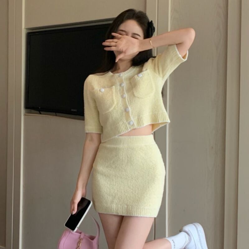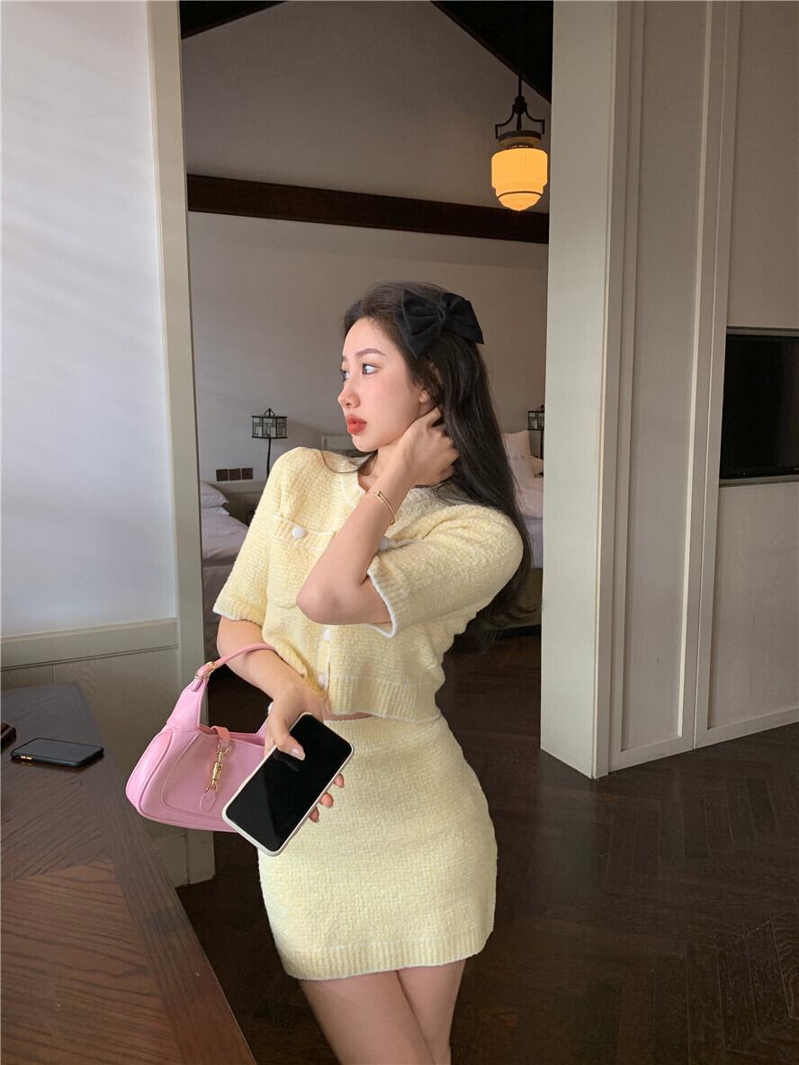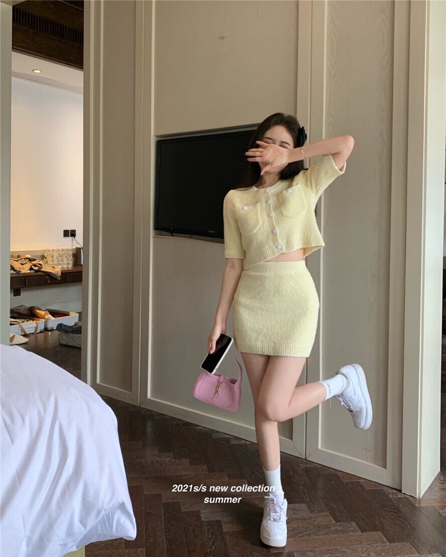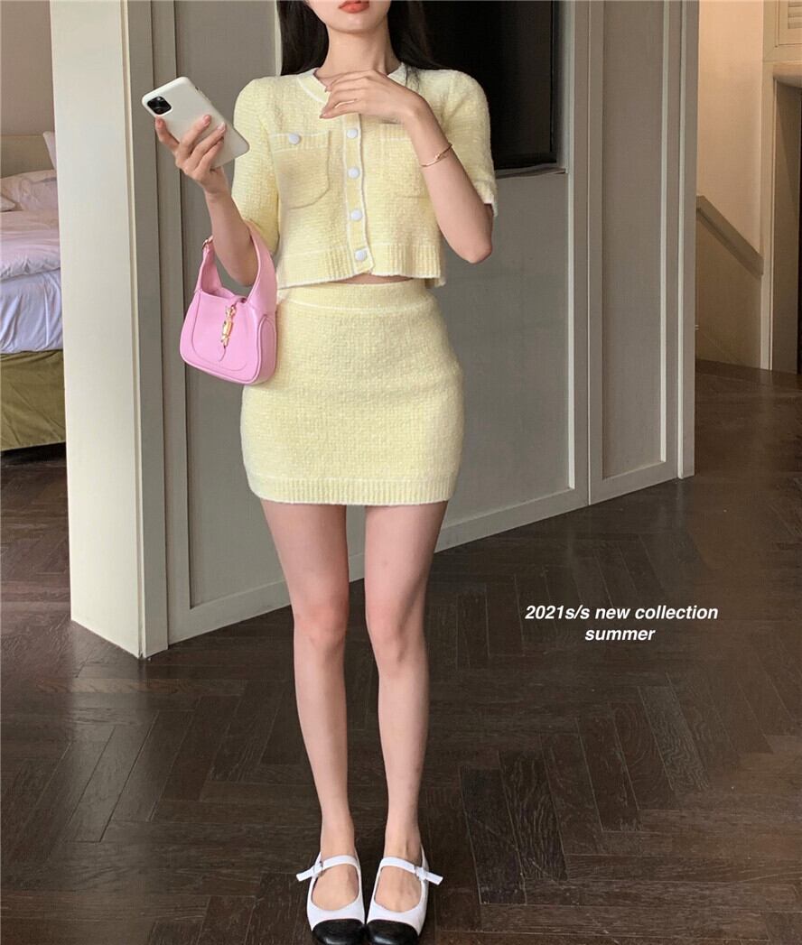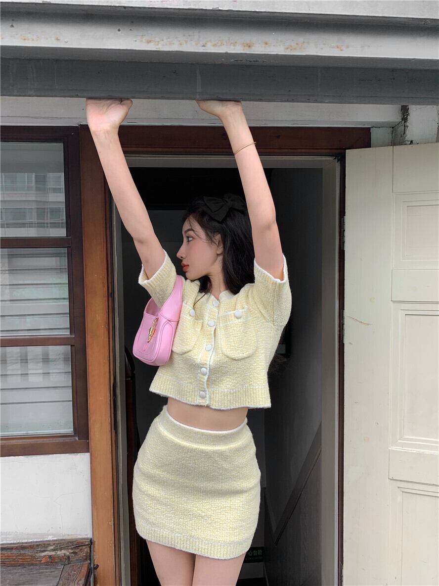ニットカーディガンジャケット 夏服薄手イエローショートセーター トップス 夏物 YY36580795305