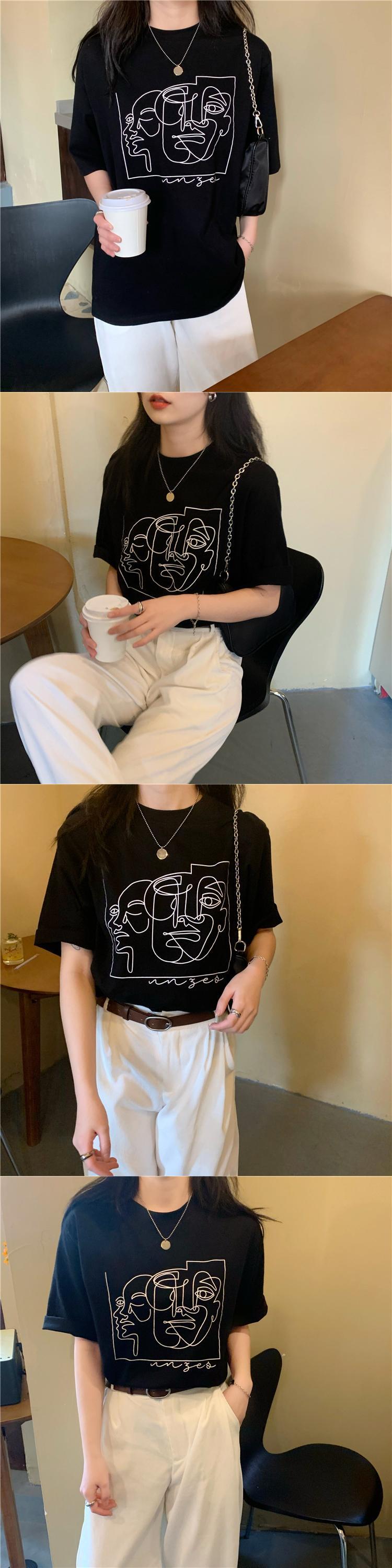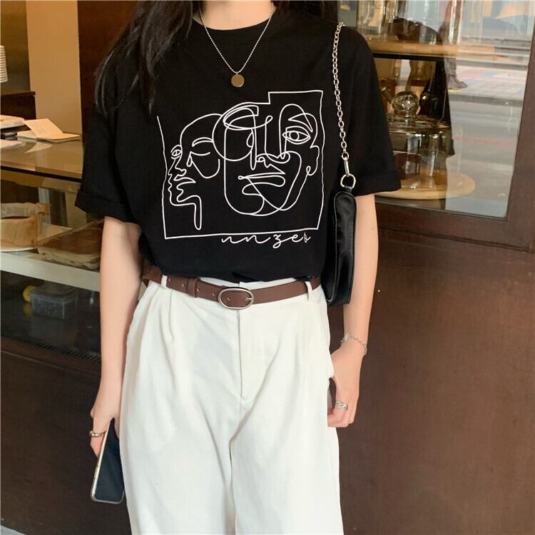 夏服韓国ファッションルーズプリント柄ブラックTシャツトップス レディース 夏物 スタイル ミドル丈 YY52342159172
