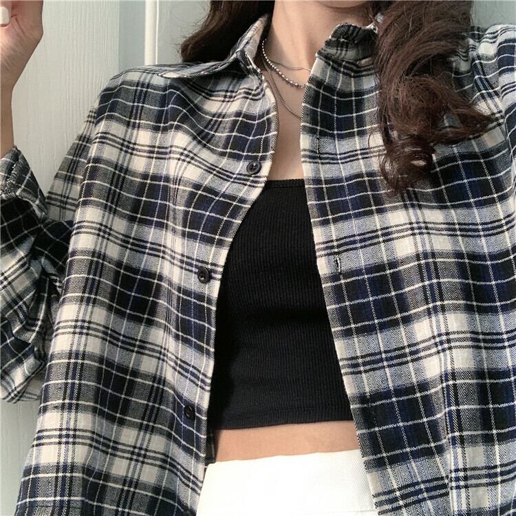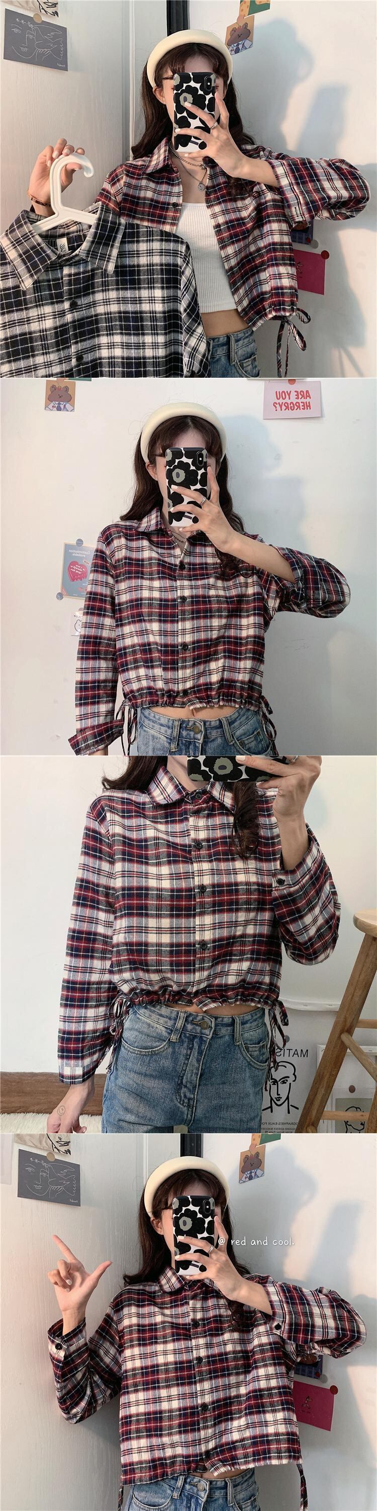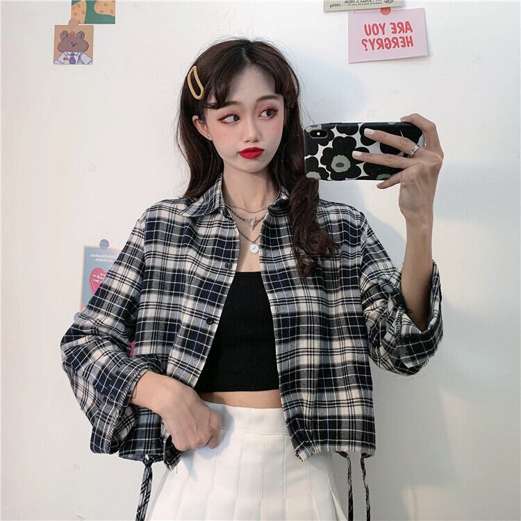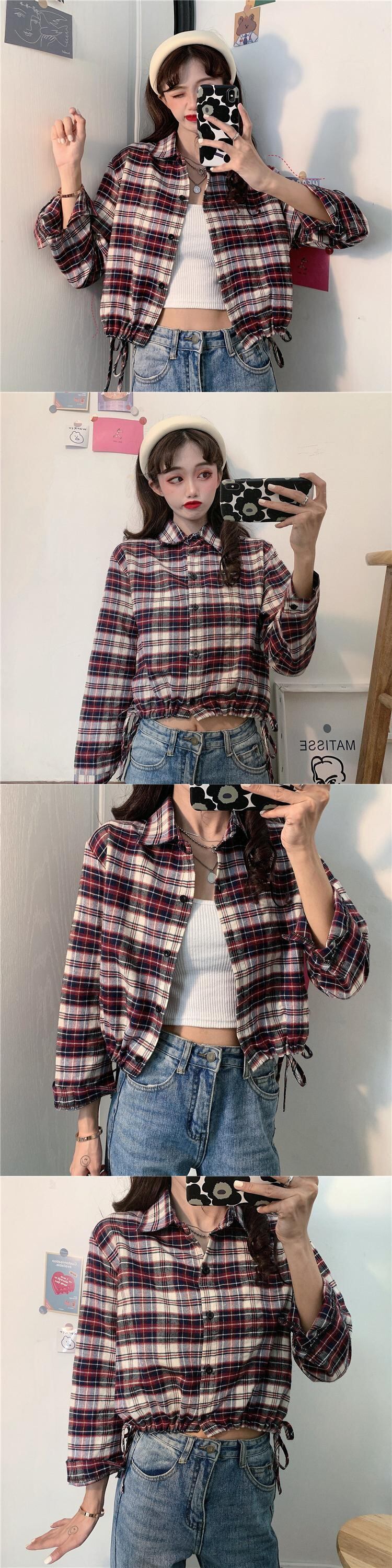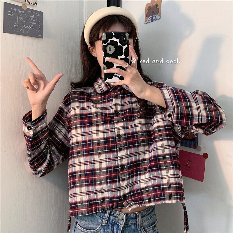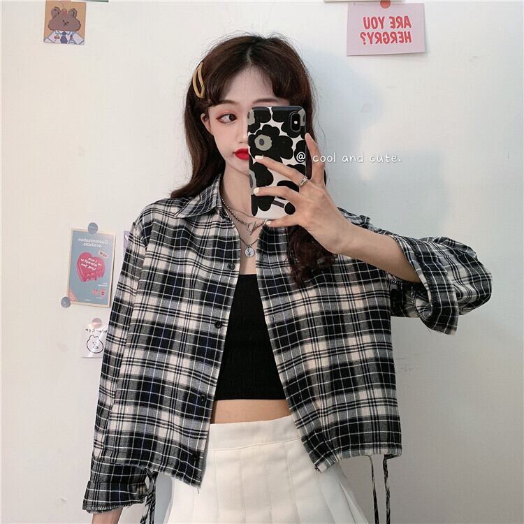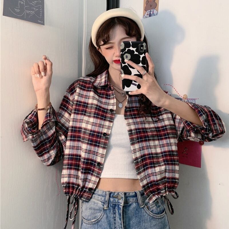 韓国ファッション薄手格子柄シャツ レディーススプリングスタンダードルーズショートトップス 長袖スリーブジャケット ロング レトロ 春物 スタイル YY17044509776