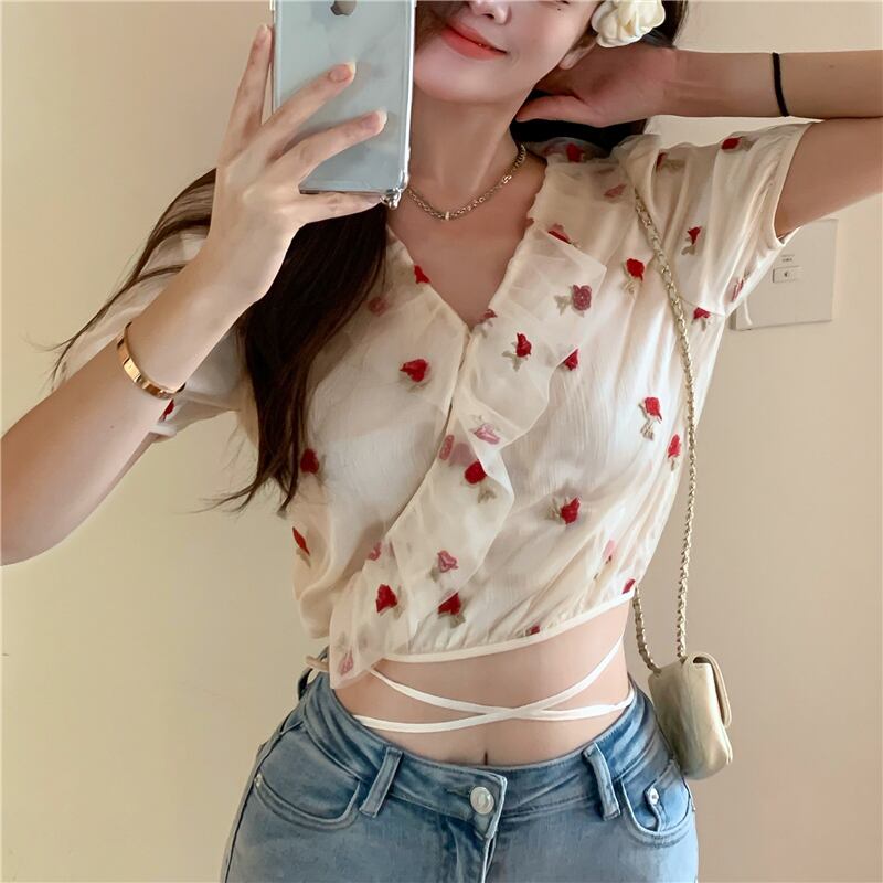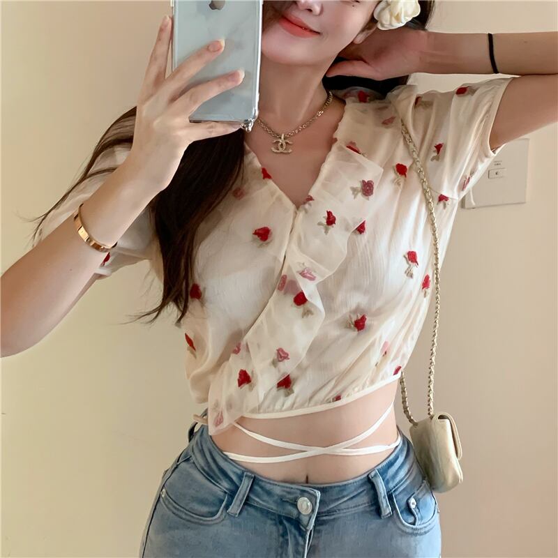 刺繍シャツ 夏服Vネックスリーブトップス 夏物 YY82156895807