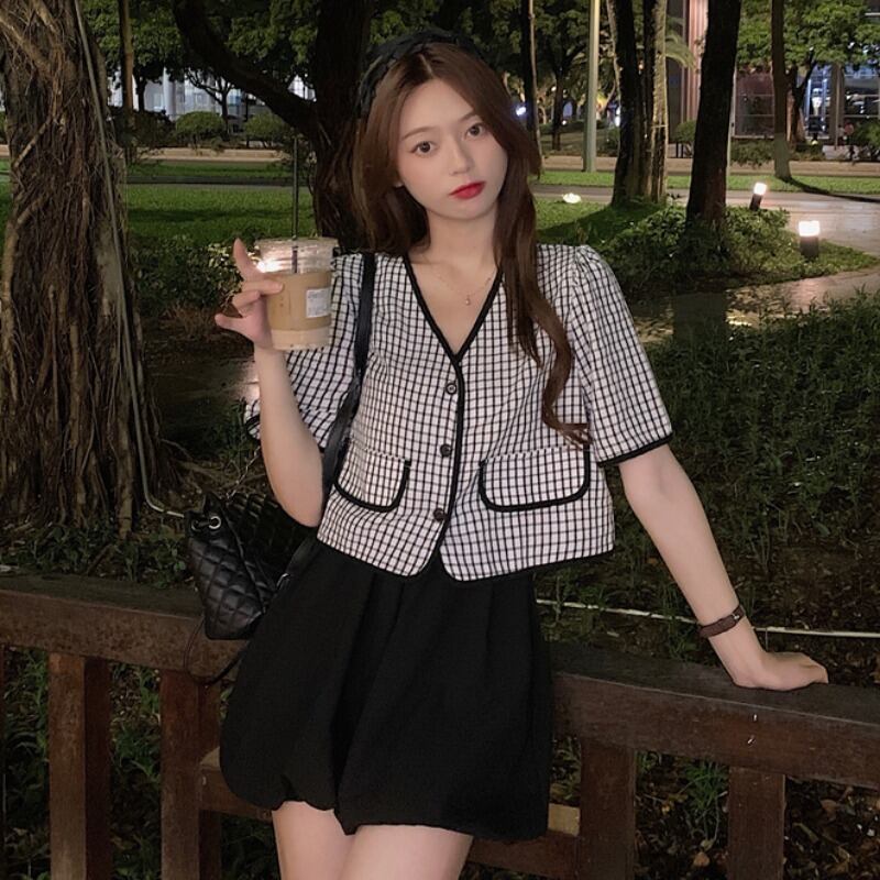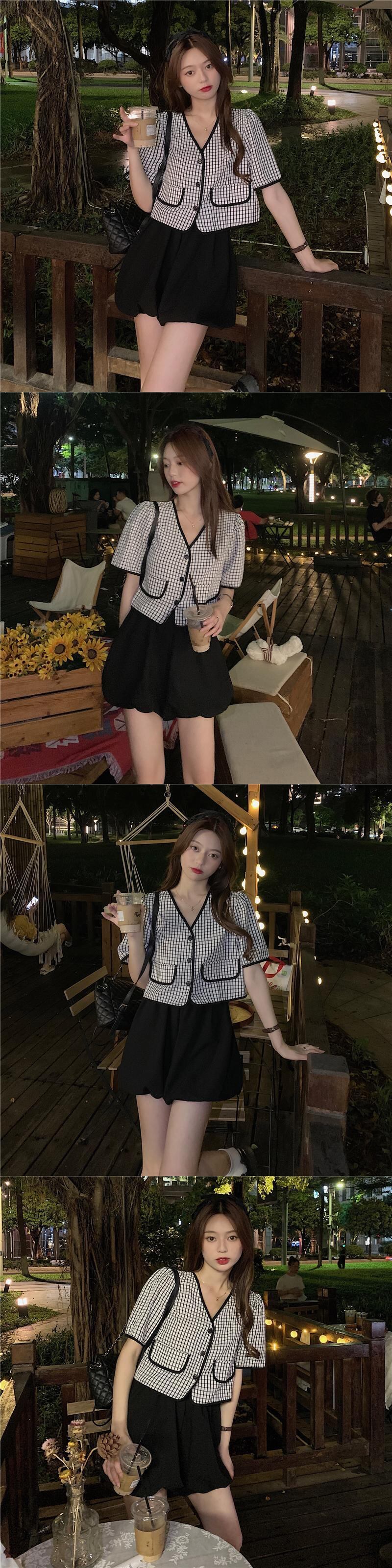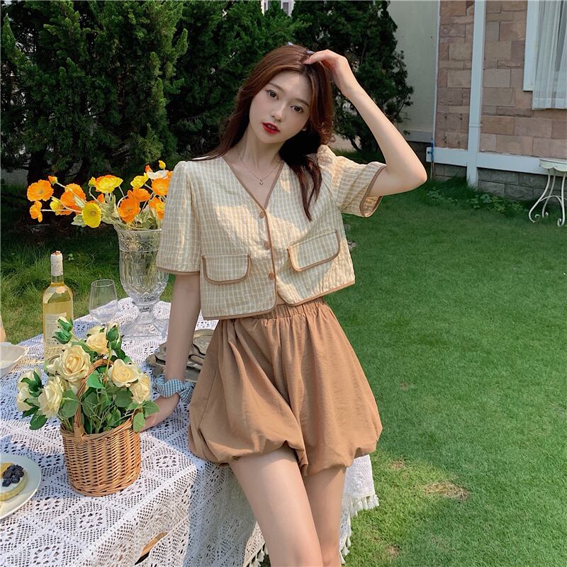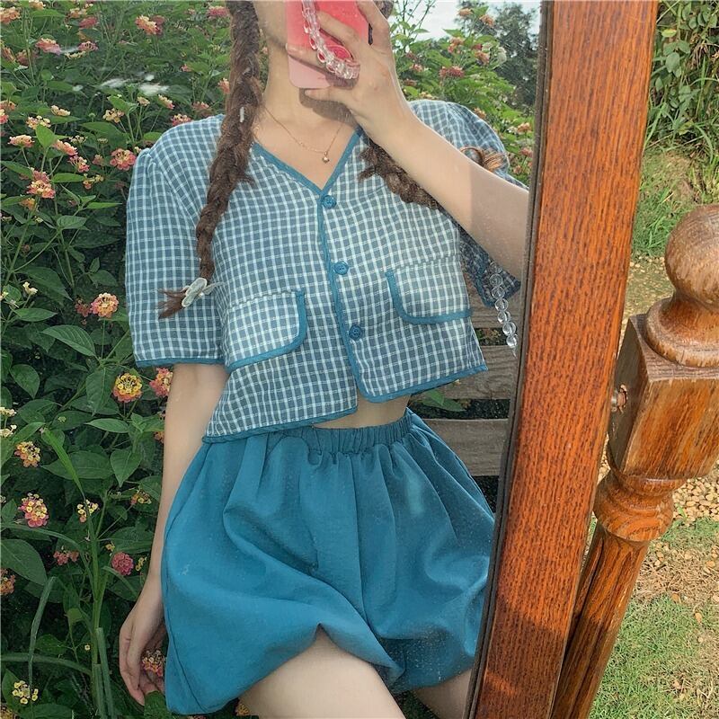 レディース夏服格子柄Vネック薄手トップス ハイウェストウェストショーツ 夏物 ウエスト YY92073569995