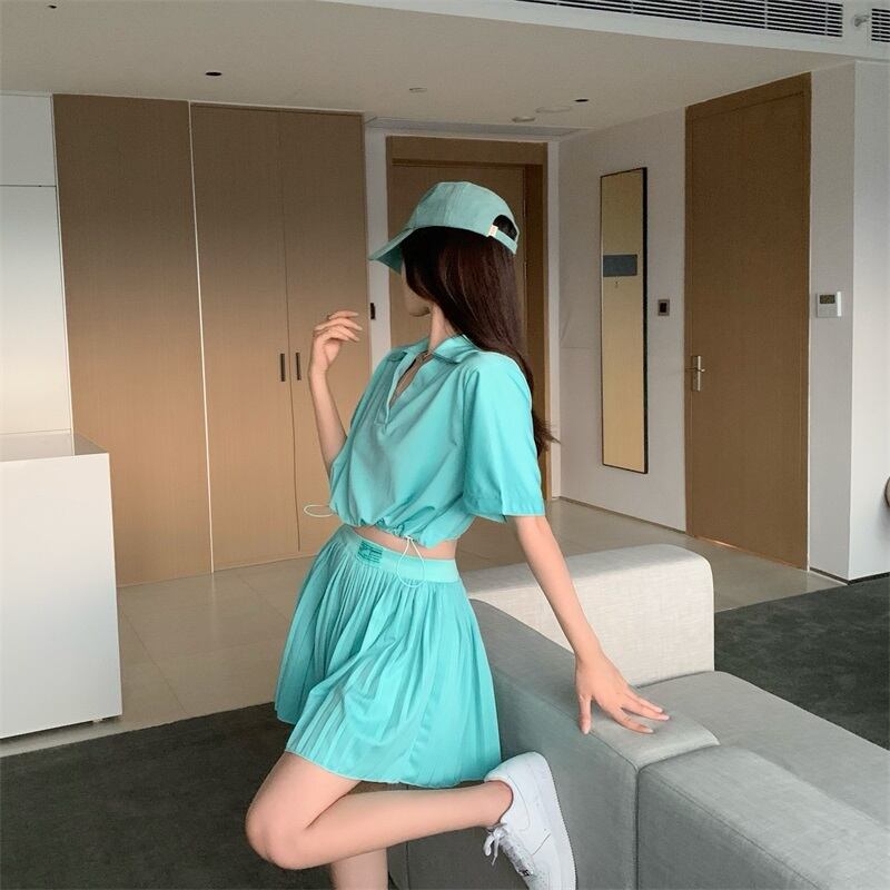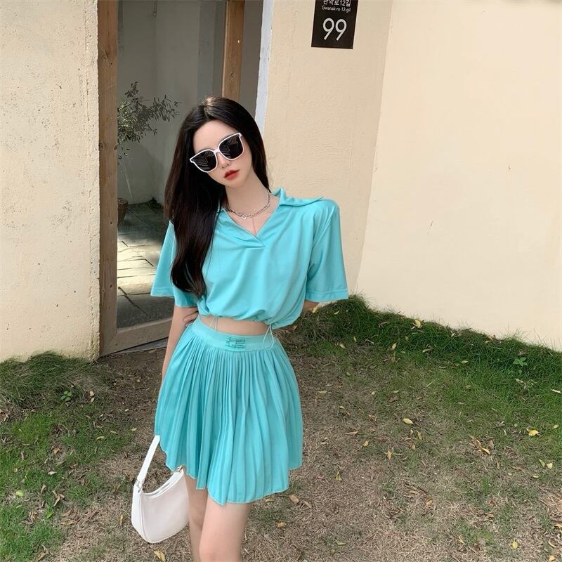 夏服Vネックギャザーショートトップス ウェストプリーツスカート セット レッド 刺繍 夏物 ウエスト YY83596370992