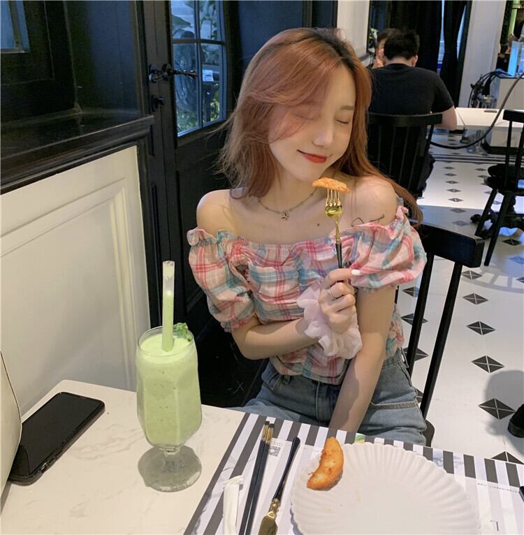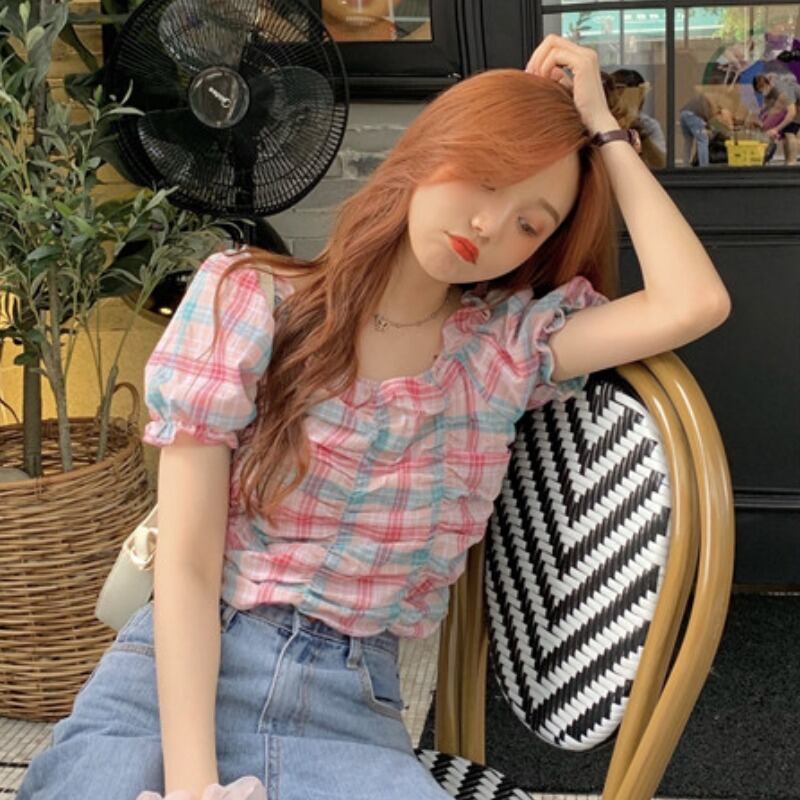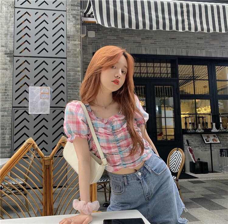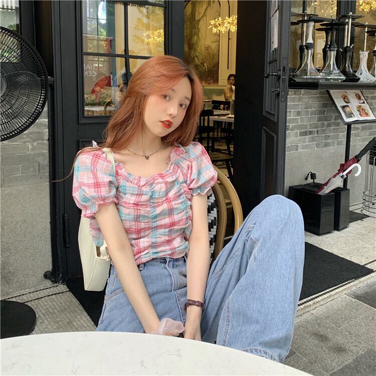 スプリング夏服韓国ファッションスタンダードスリーブショート格子柄シャツ 半袖トップス レディース ピンク レトロ ハーフスリーブ 大人ガーリー スウィート キュート カジュアル 春物 夏物 YY99792816338