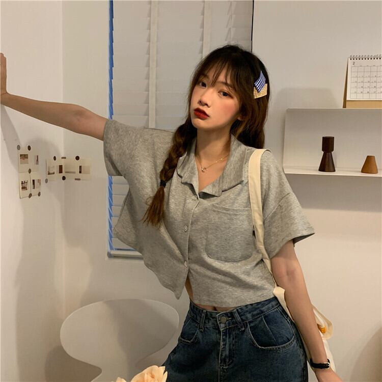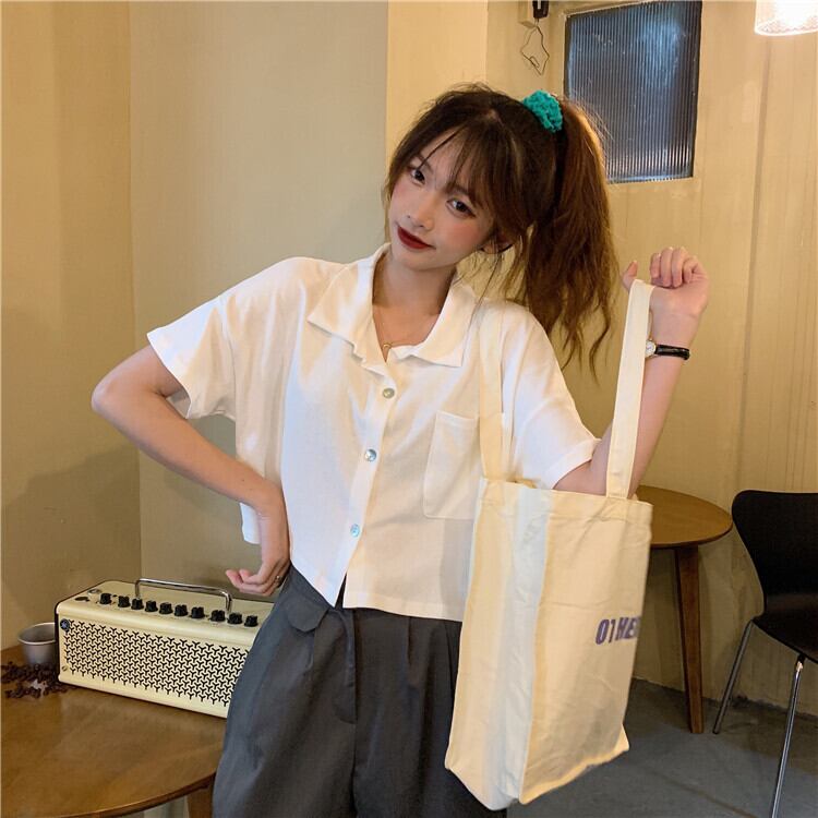 ウェストショートトップス レディースルーズ夏服シャツ Vネックスタイル薄手ホワイト 夏物 ウエスト YY12598476396