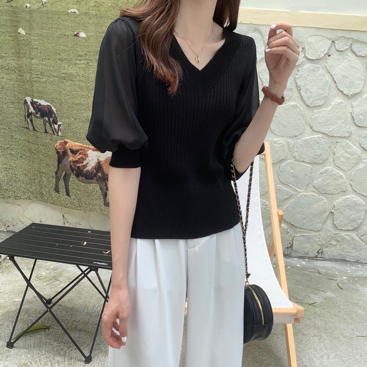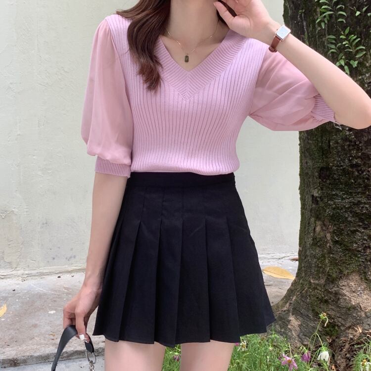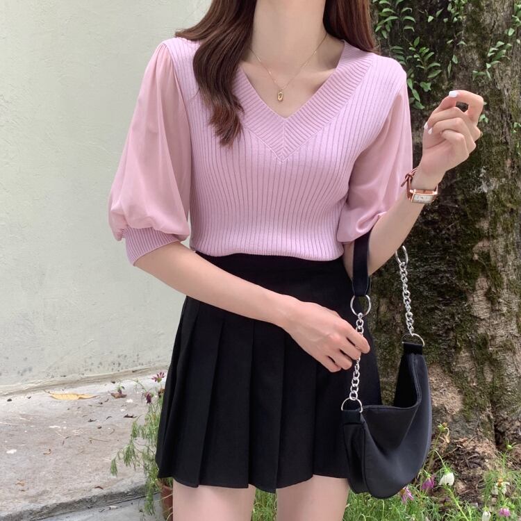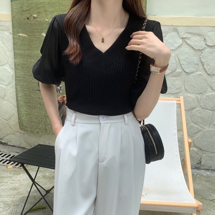 ホワイトVネックセーター 夏服韓国ファッションルーズ薄手カジュアルトップス 夏物 スタイル YY60964859325