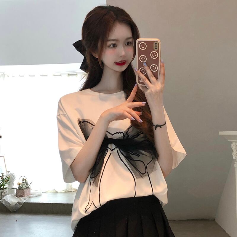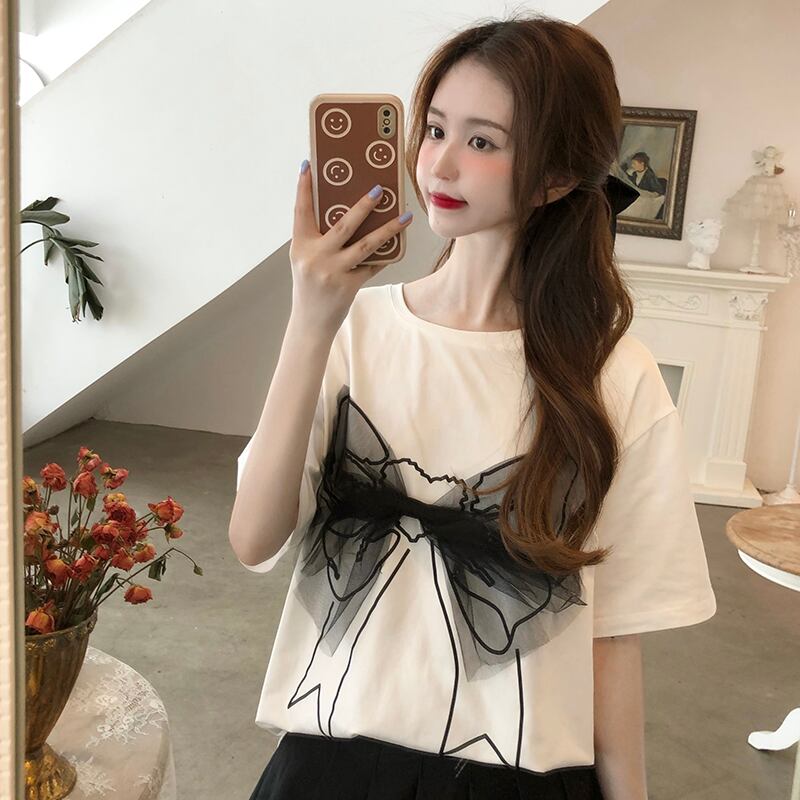 夏服韓国ファッションメッシュリボンTシャツレディースルーズホワイトトップス 夏物 スタイル YY68172704053