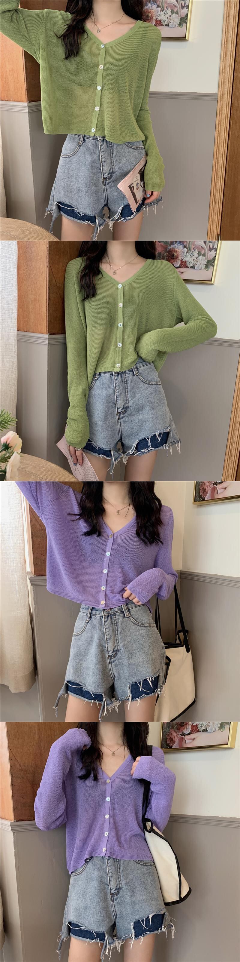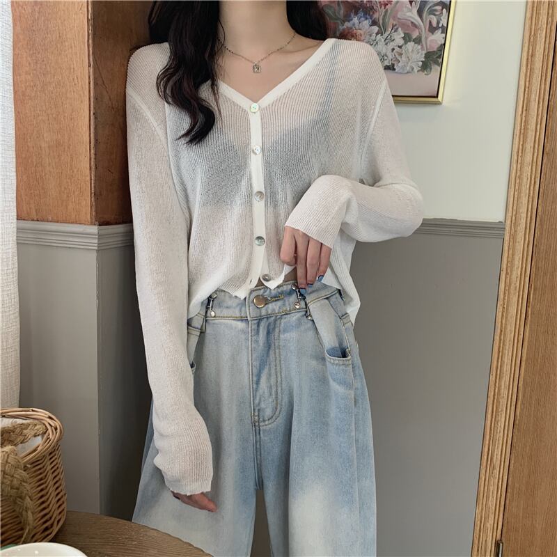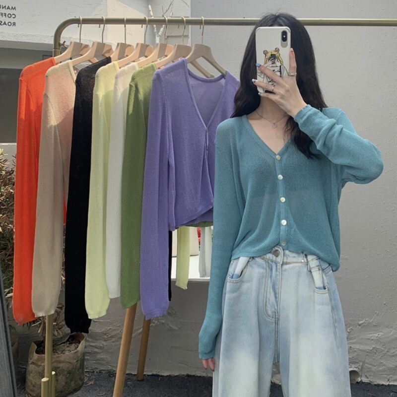 韓国ファッションルーズ薄手ソリッド カラーVネックセーター スプリング夏服スリムカーディガン ロング 春物 夏物 ソリッドカラー スタイル 長袖 YY42188093137